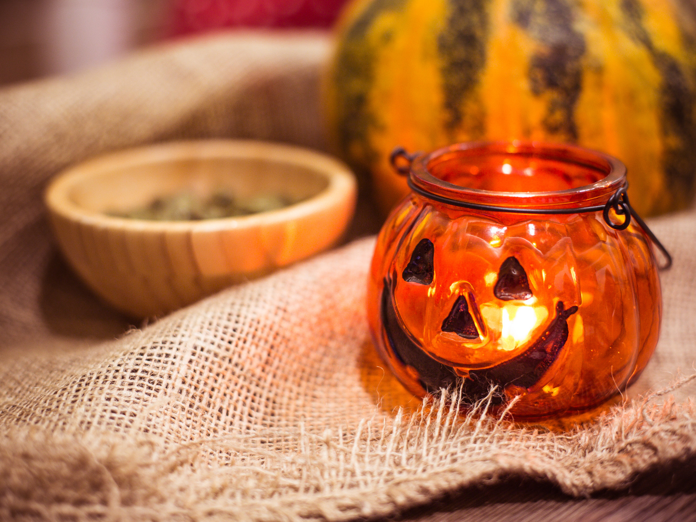 Светильник тыква на столе на праздник Хэллоуин Обои для рабочего стола 1400x1050