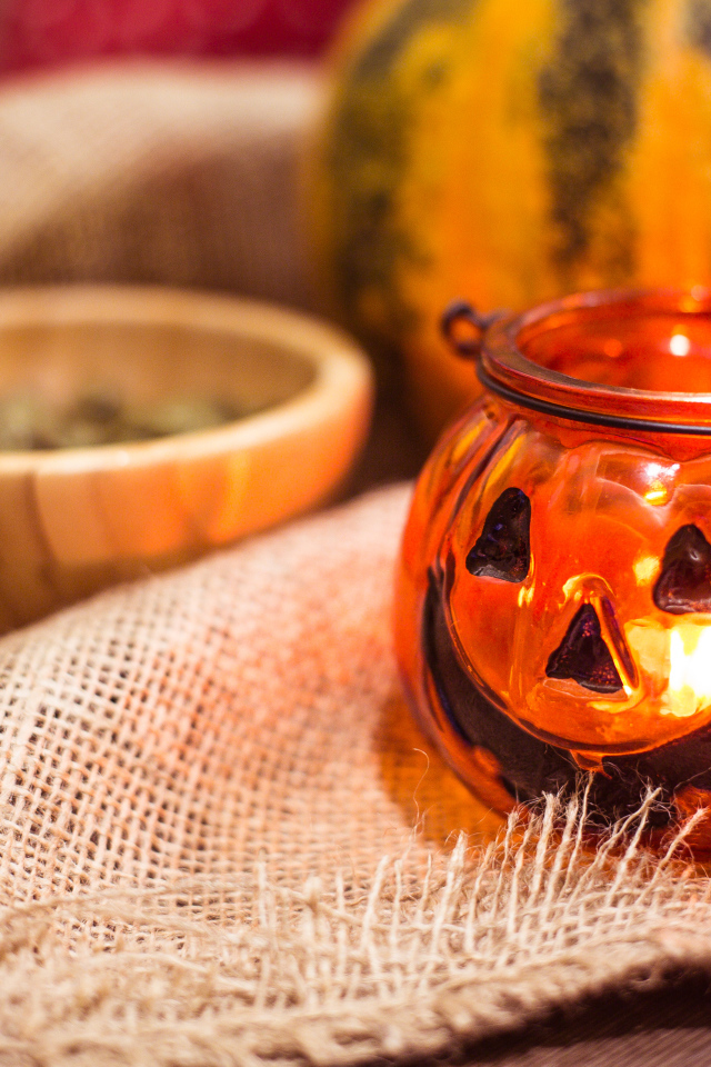 Светильник тыква на столе на праздник Хэллоуин Обои для рабочего стола 640x960