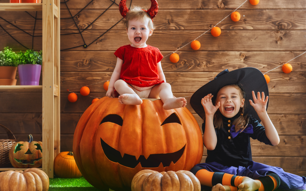 Две маленькие девочки с тыквой в костюмах на Хэллоуин - 6000x4102