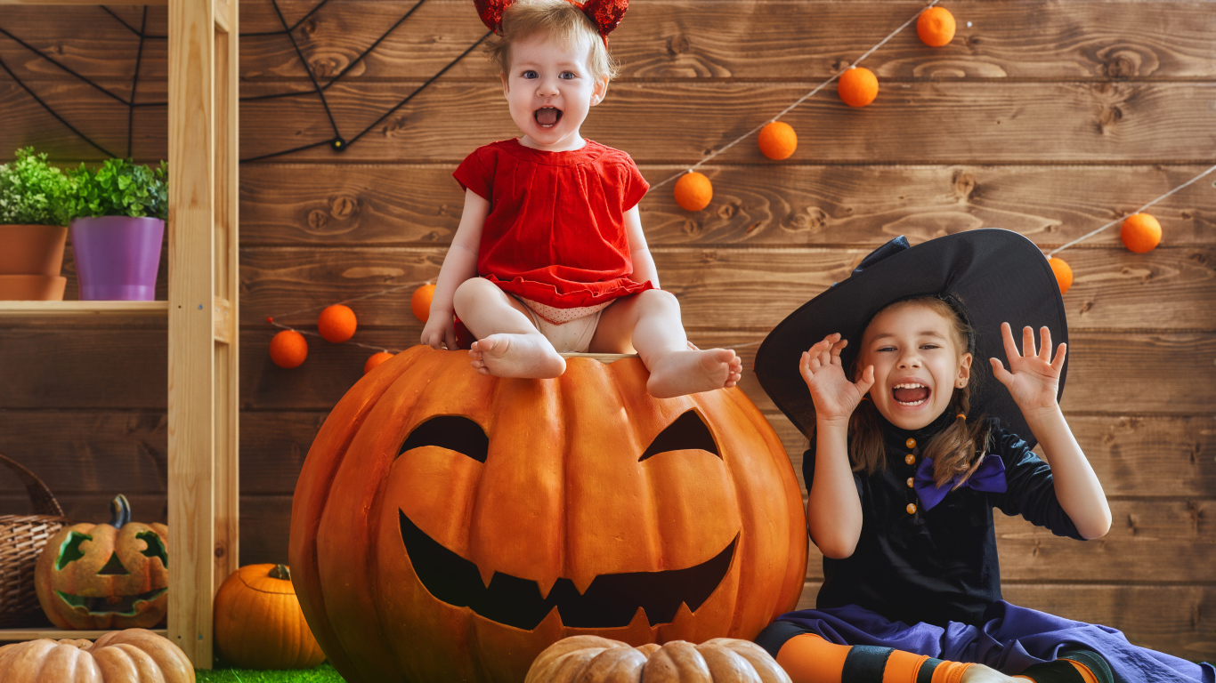 Две маленькие девочки с тыквой в костюмах на Хэллоуин - 6000x4102