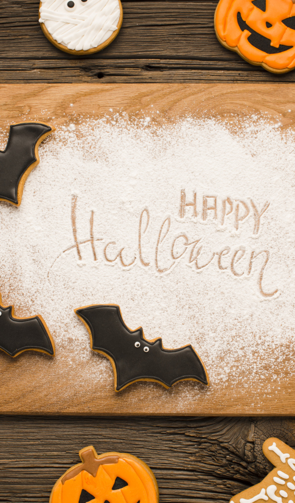 Открытка на праздник Хэллоуин с печеньем и доской Обои для рабочего стола 600x1024