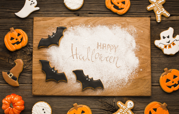 Открытка на праздник Хэллоуин с печеньем и доской Обои для рабочего стола 600x382