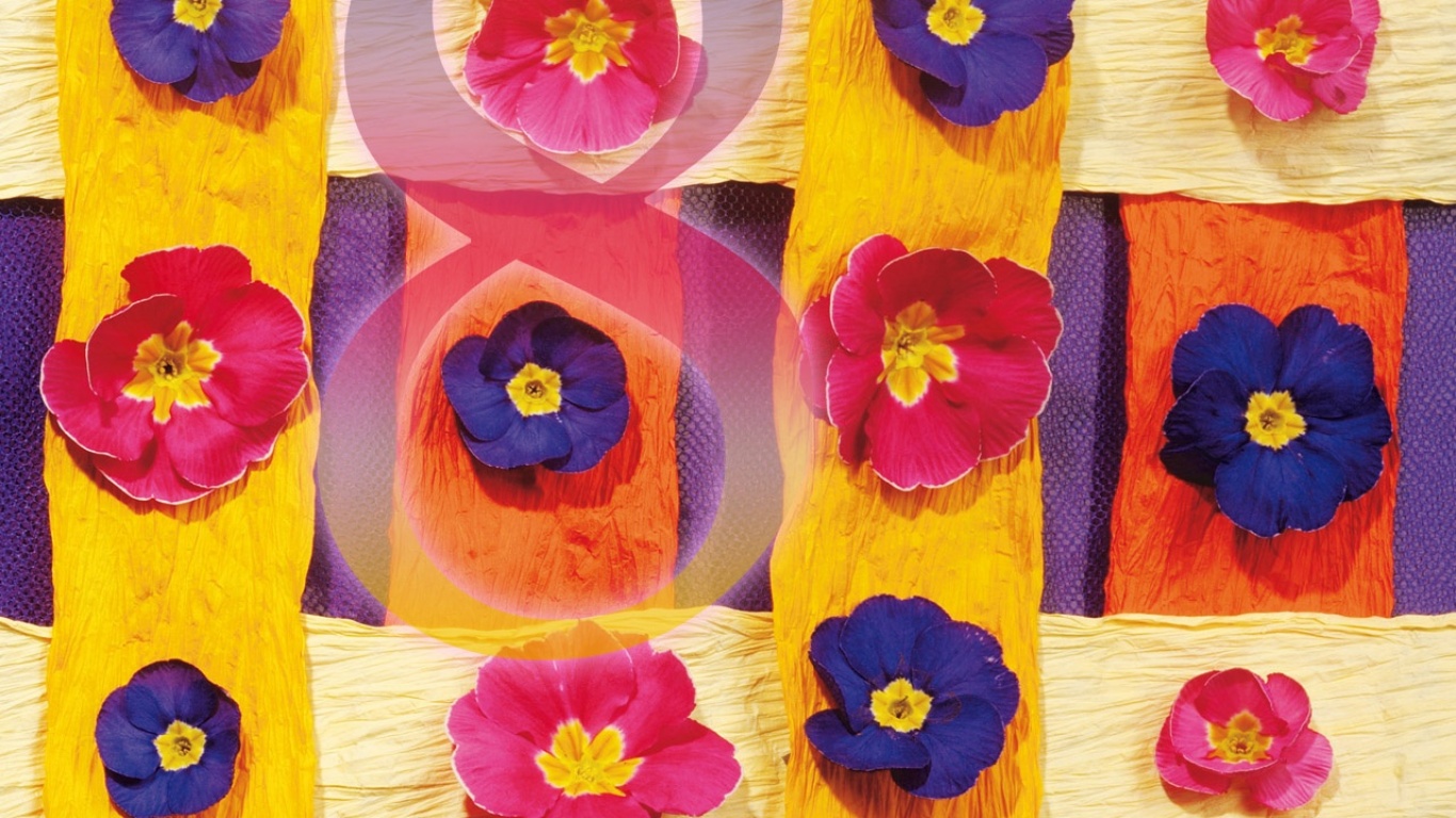 Будильник, цветы и декор на голубом фоне на 8 марта