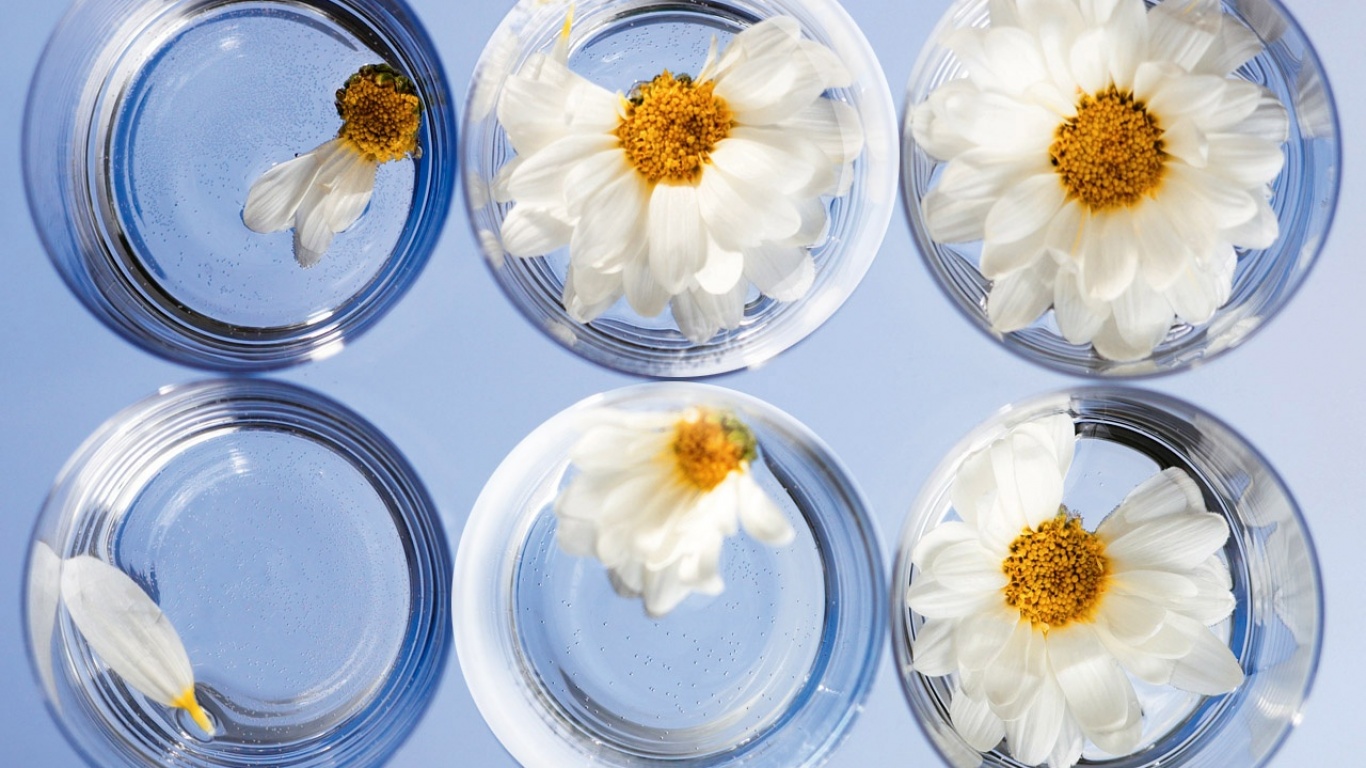 Будильник, цветы и декор на голубом фоне на 8 марта