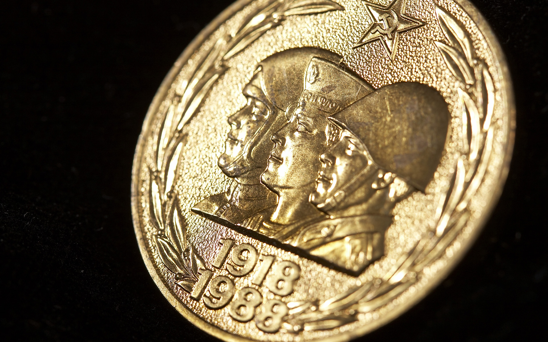 Красные гвоздики с лентами на сером фоне на День Победы 9 мая