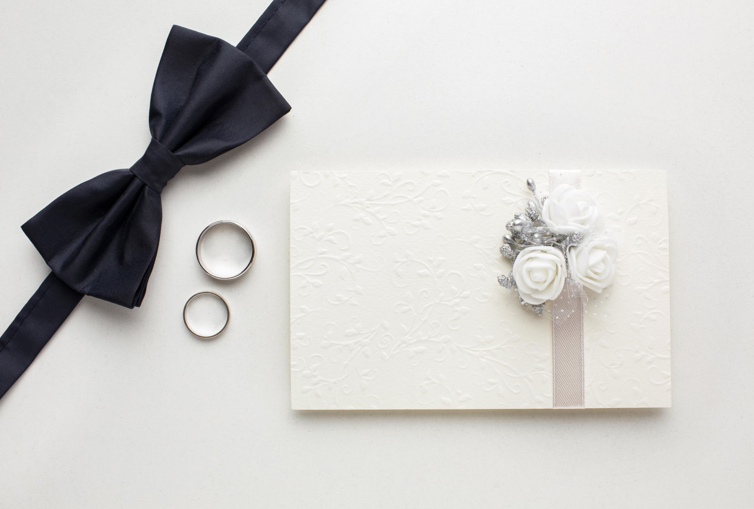 Приглашение на свадьбу, кольца и черная бабочка - 2526x1707