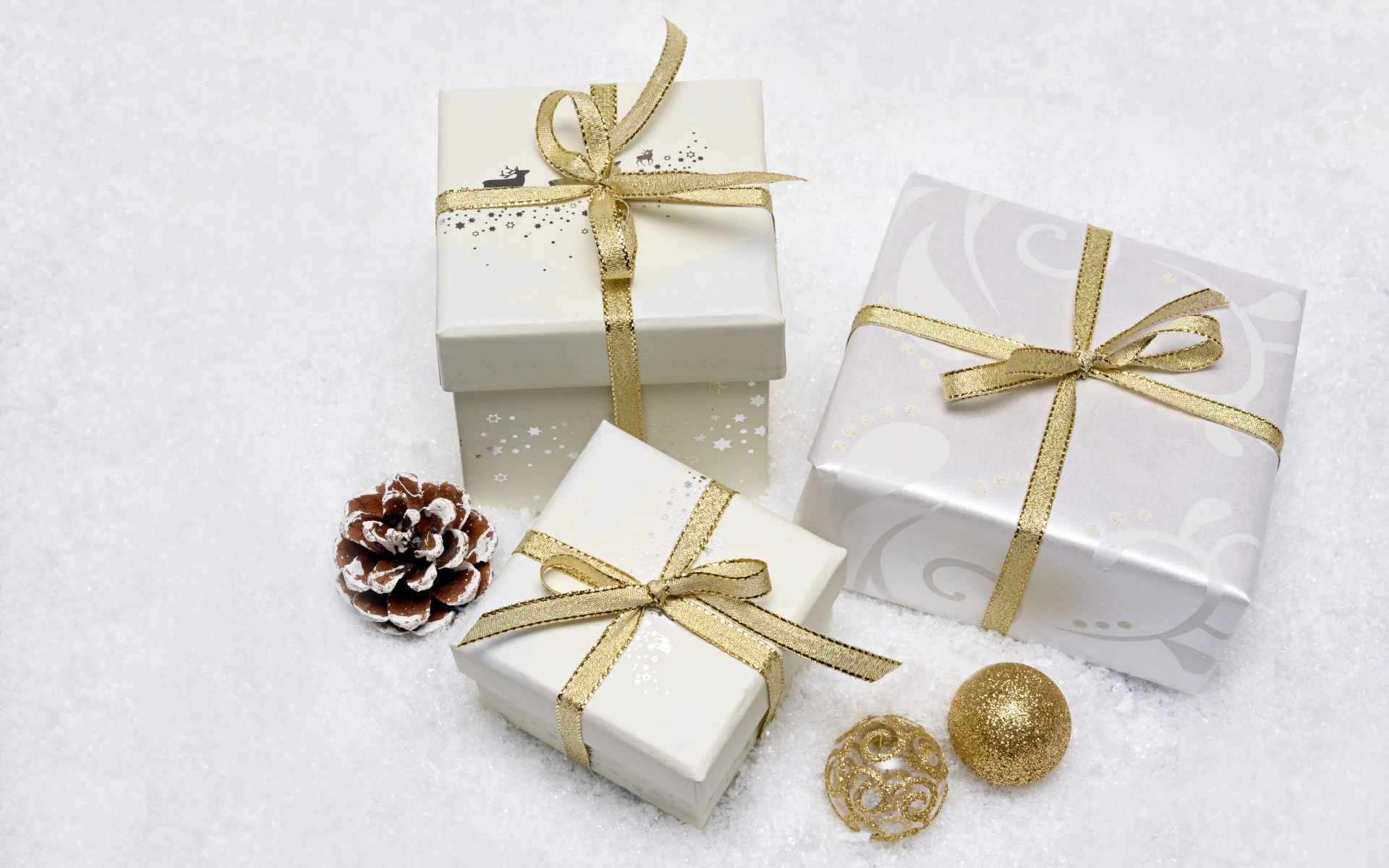 Три коробки с подарками с золотистыми бантами из ленты - 6000x4000
