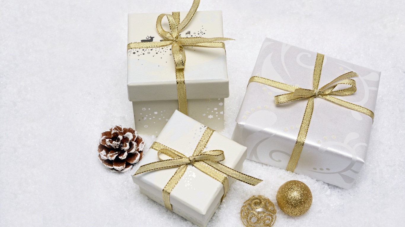Три коробки с подарками с золотистыми бантами из ленты Обои для рабочего стола 1366x768