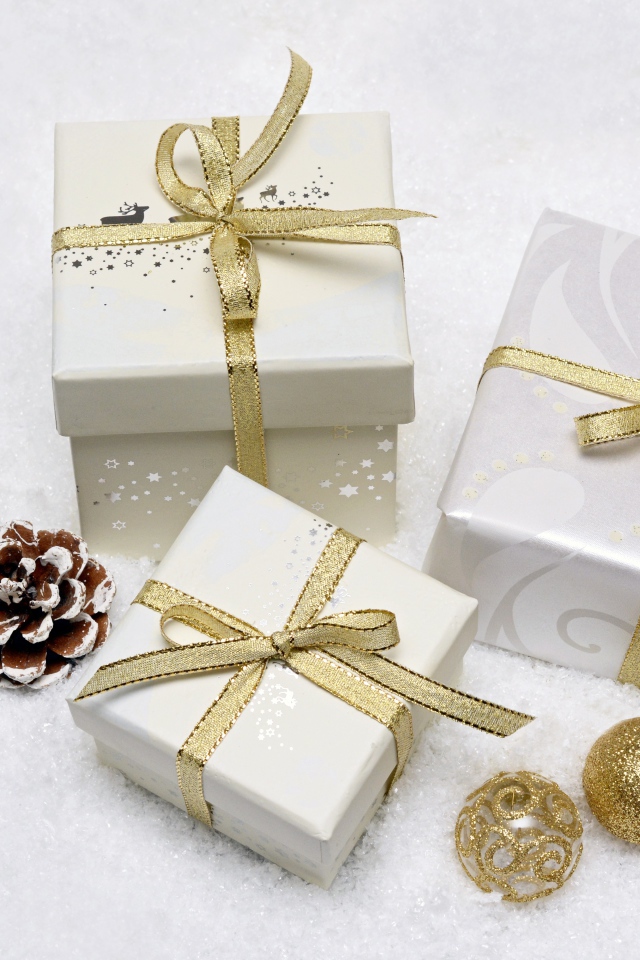 Три коробки с подарками с золотистыми бантами из ленты - 6000x4000