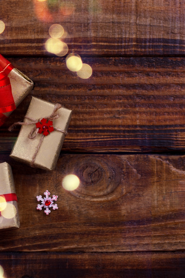 Праздничные подарки на деревянном фоне Обои для рабочего стола 640x960