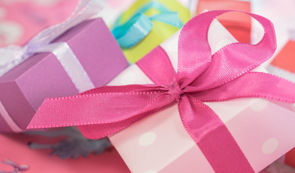 Розовый подарок с бантом из ленты крупным планом Обои для рабочего стола 1024x600