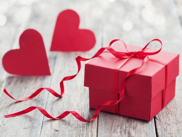 Обои: Красная коробка с подарком на столе с красными сердечками