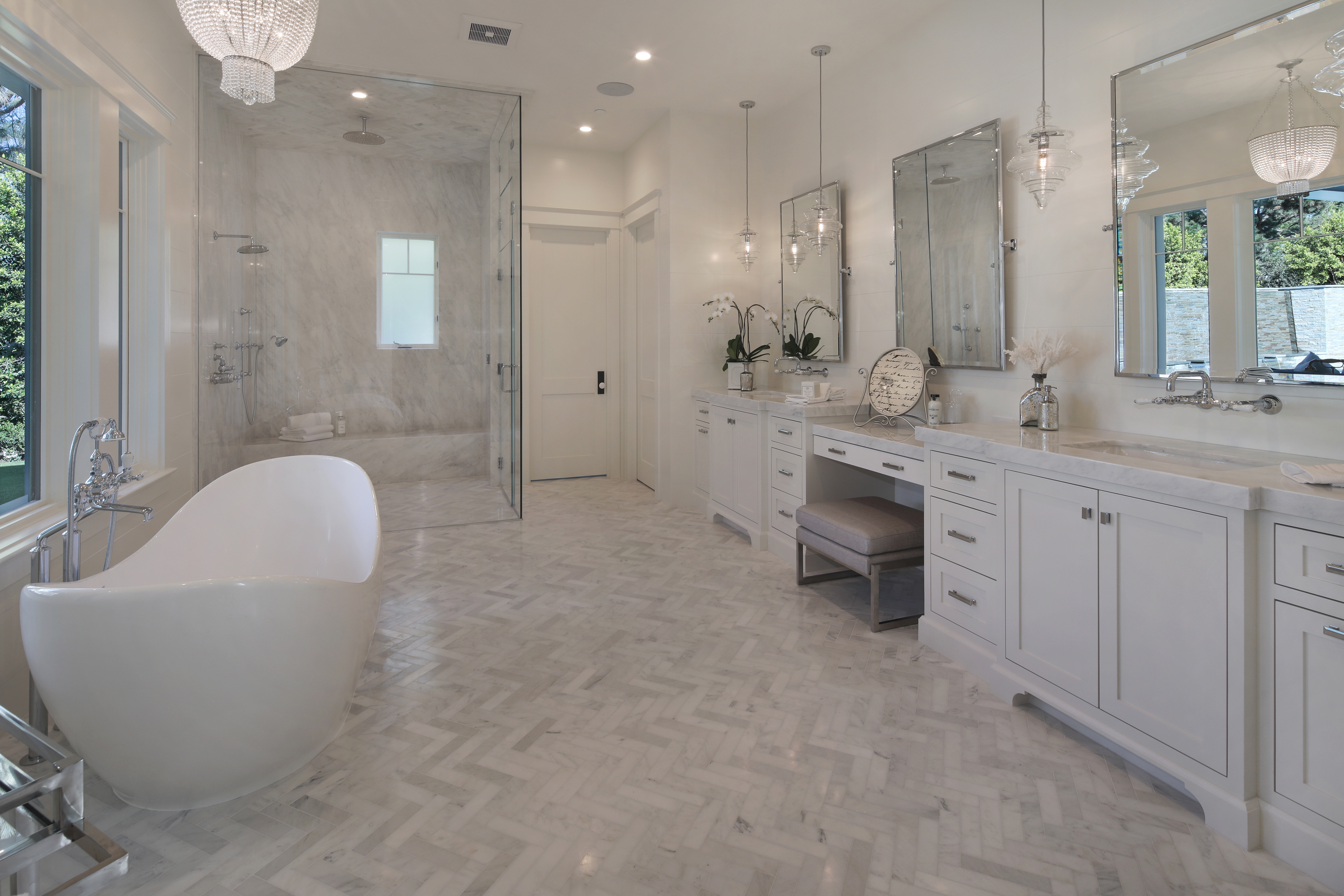 Интерьер ванной комнаты с большой ванной и стенами оранжевого цвета