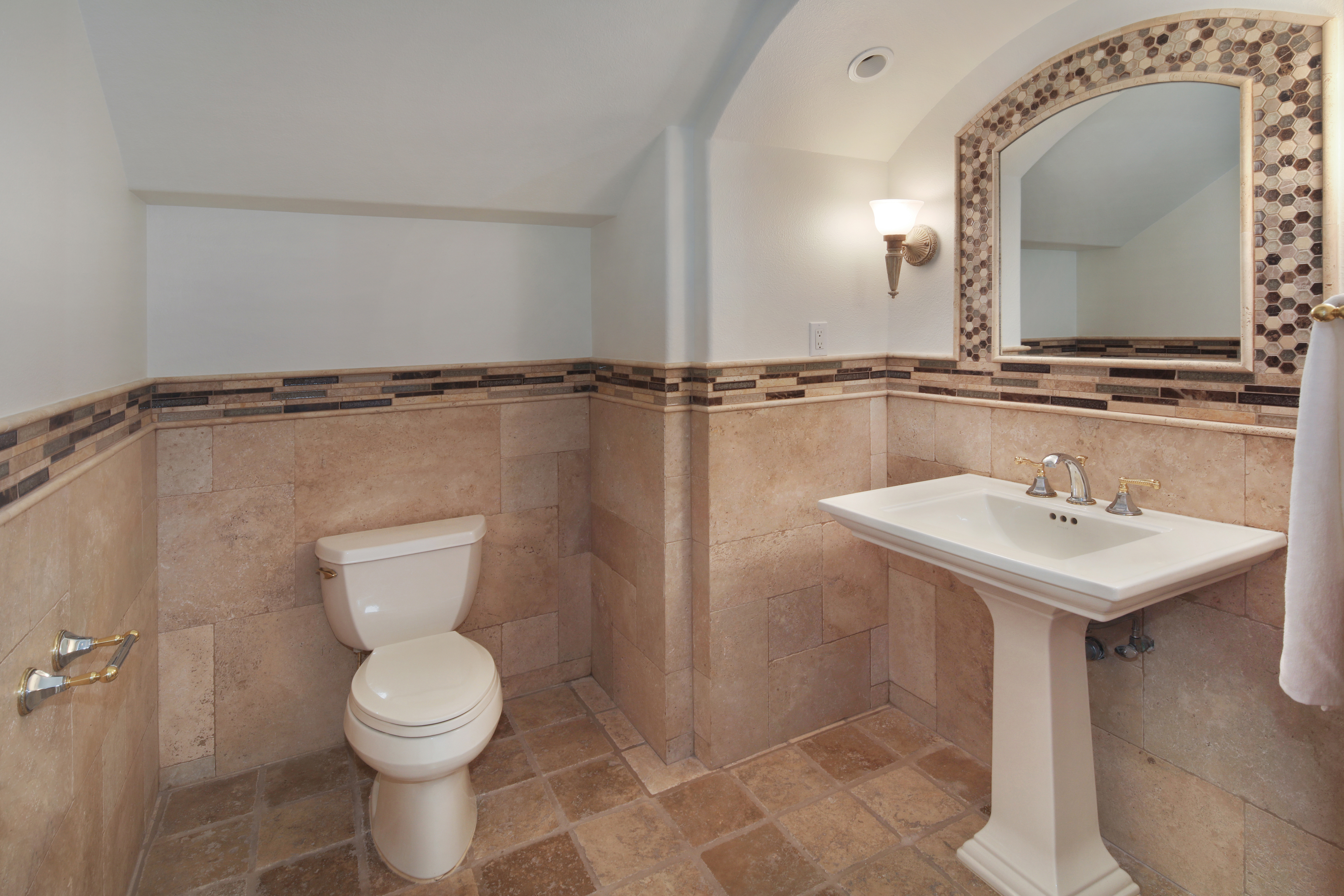 Интерьер ванной комнаты с большой ванной и стенами оранжевого цвета