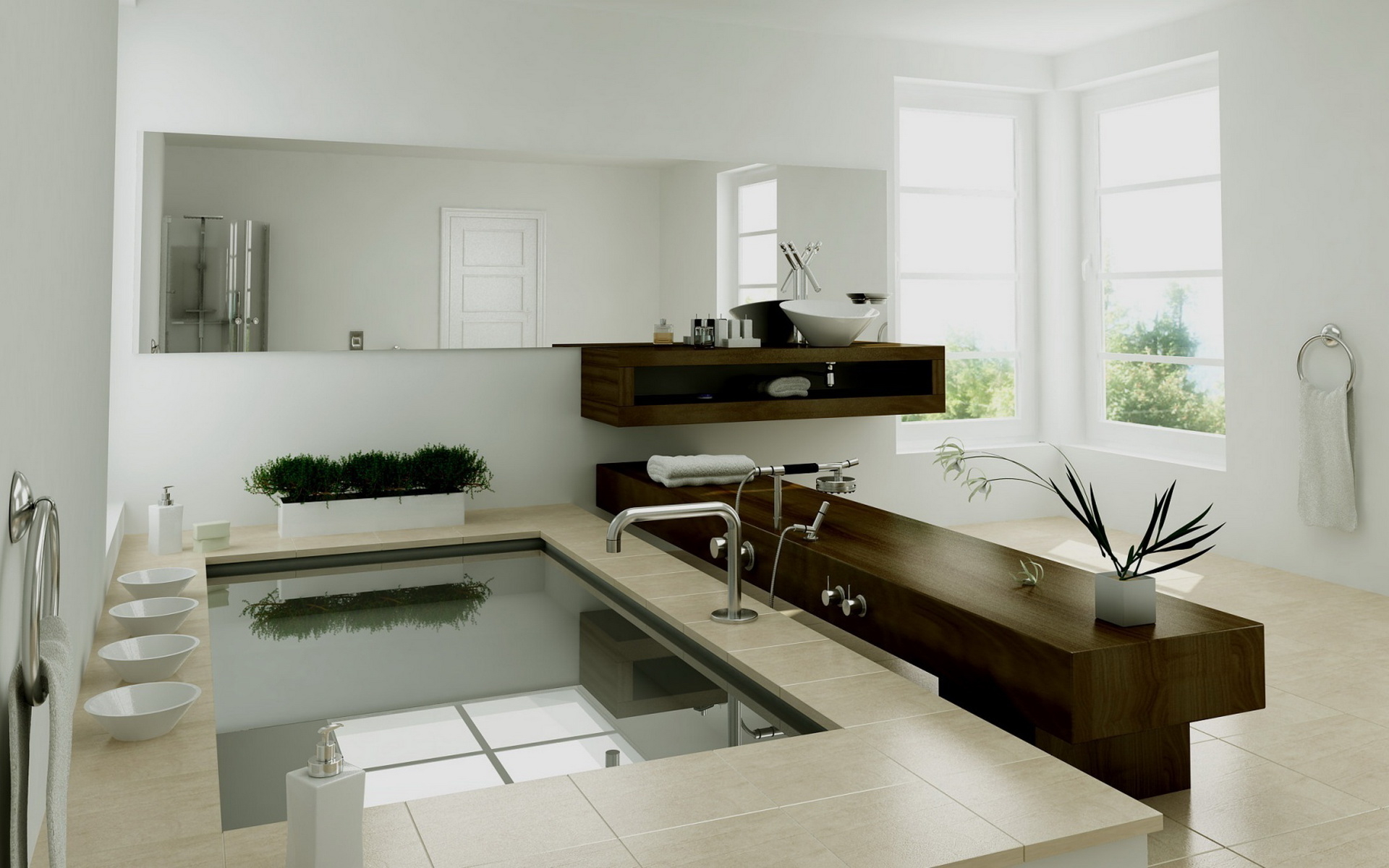 Интерьер ванной комнаты с большой ванной и стенами оранжевого цвета