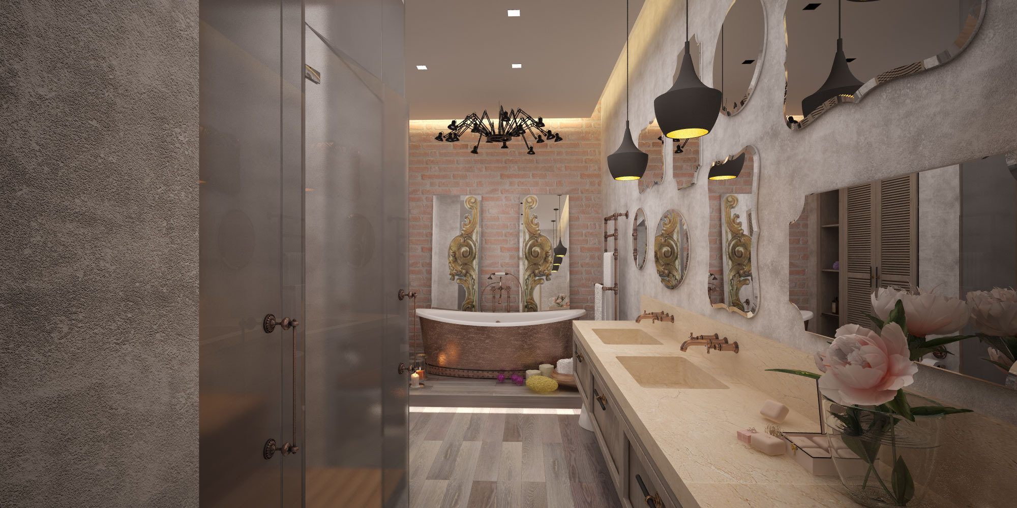 Интерьер ванной комнаты с большой ванной и стенами оранжевого цвета