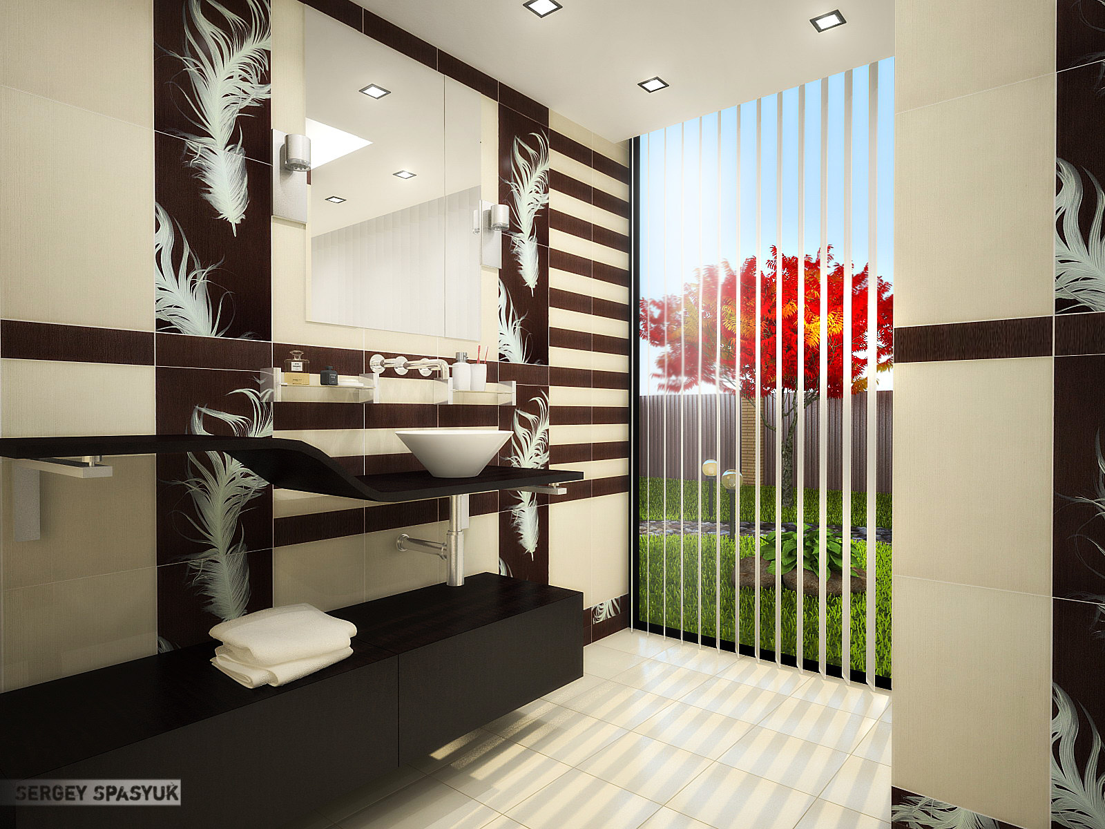 Интерьер ванной комнаты с большой ванной и стенами оранжевого цвета