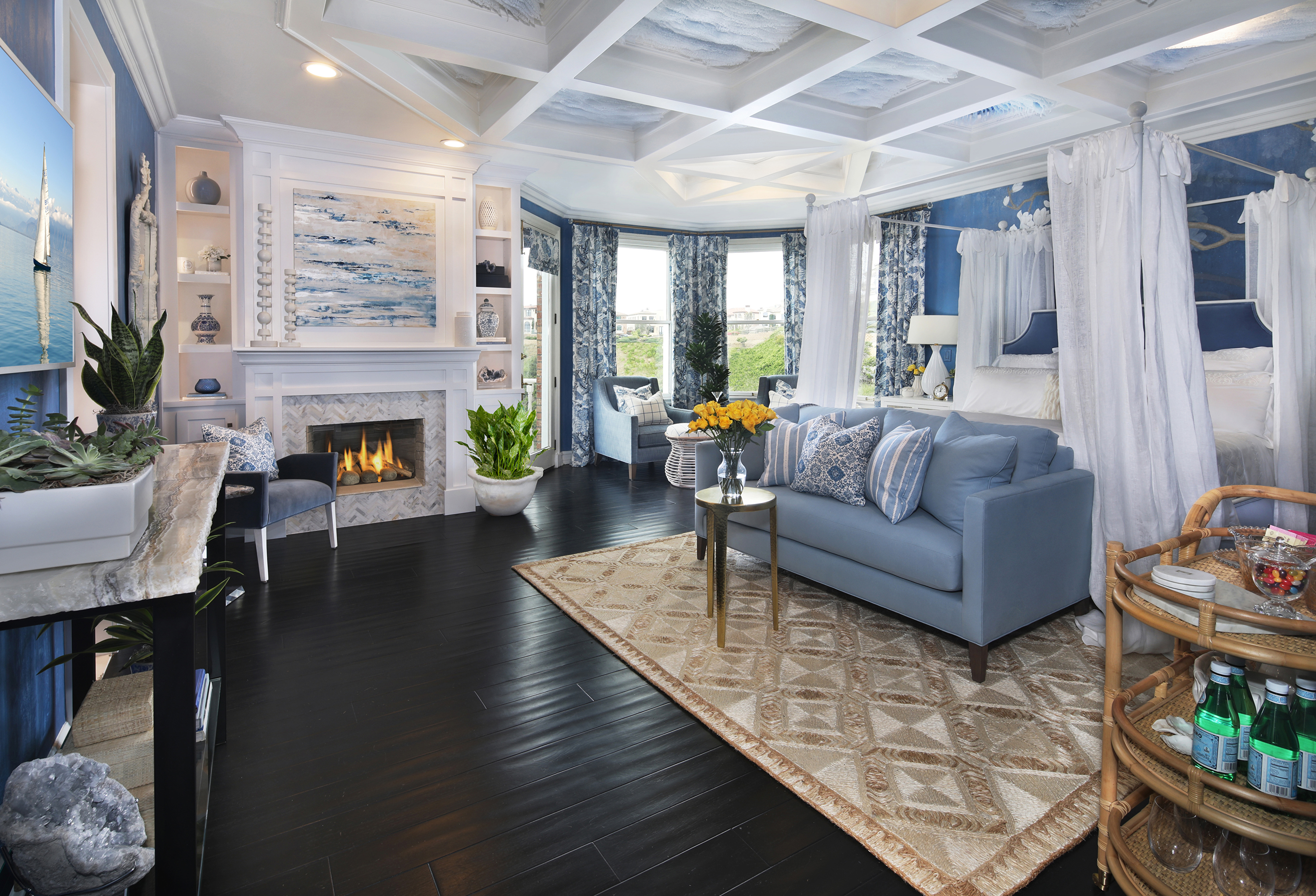 Просторная спальня с диваном и камином