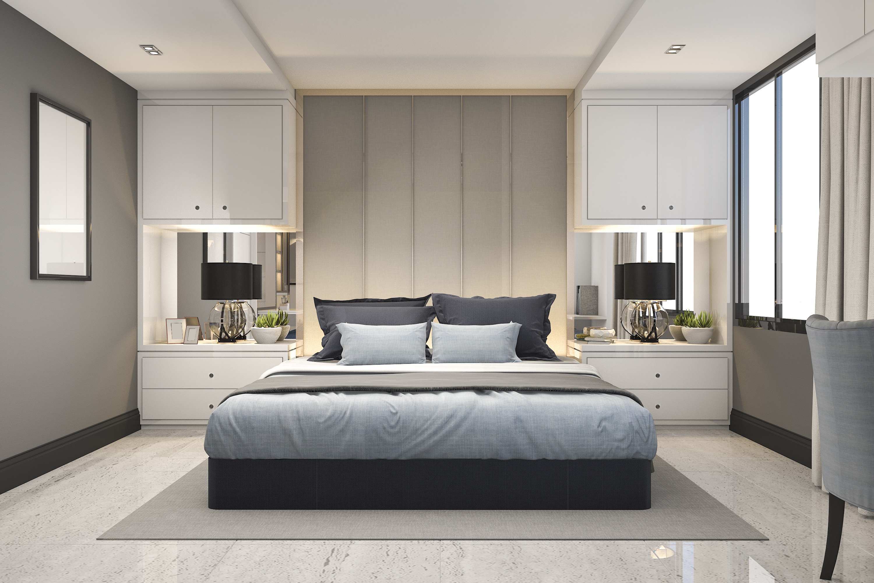 Большая двуспальная кровать в серой спальне - 3000x2000