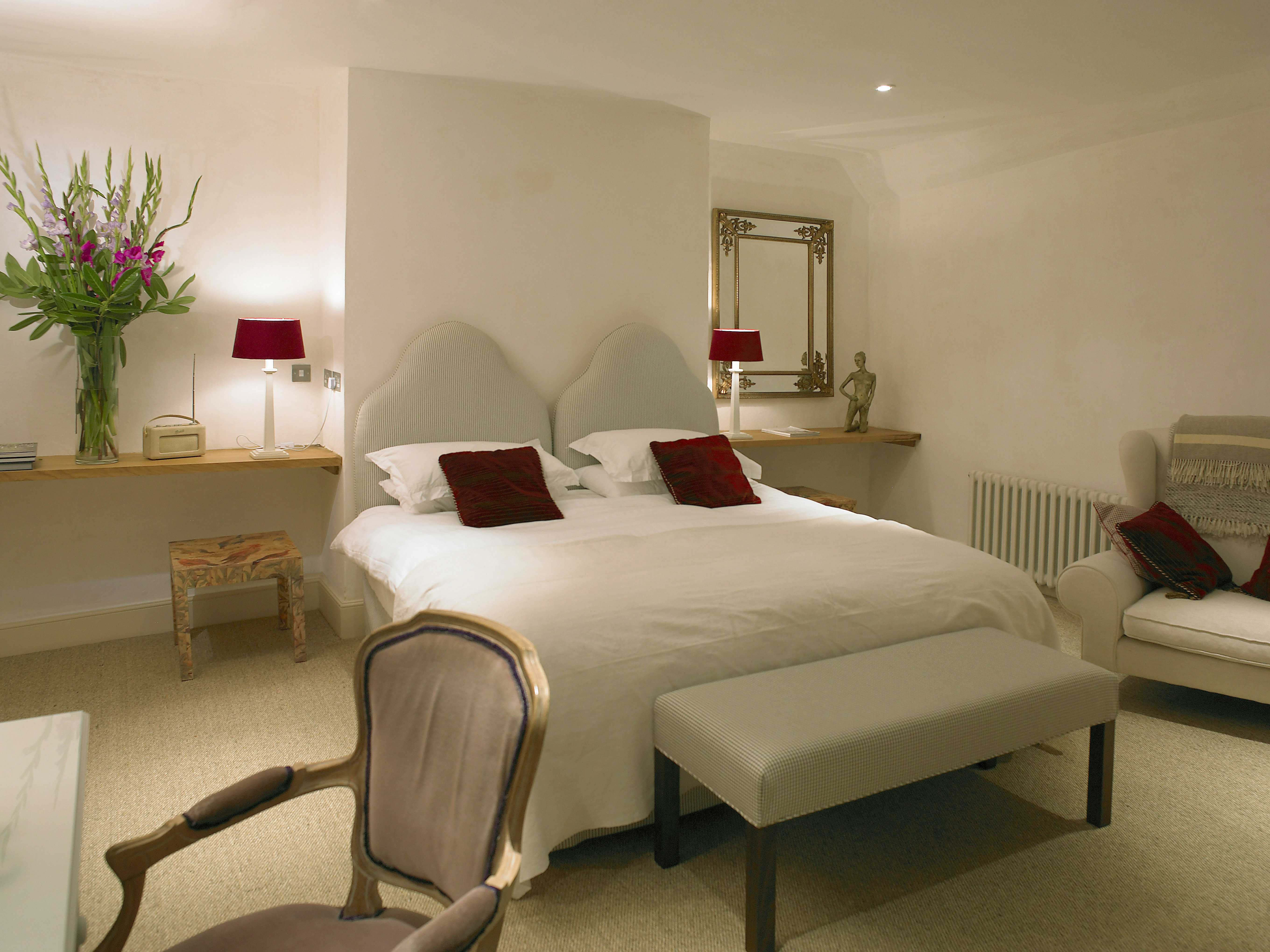 Спальня с белой кроватью и большим зеркалом