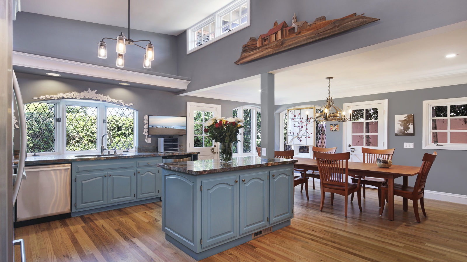 Большая красивая кухня в сером цвете с деревянным столом Обои для рабочего стола 1600x900