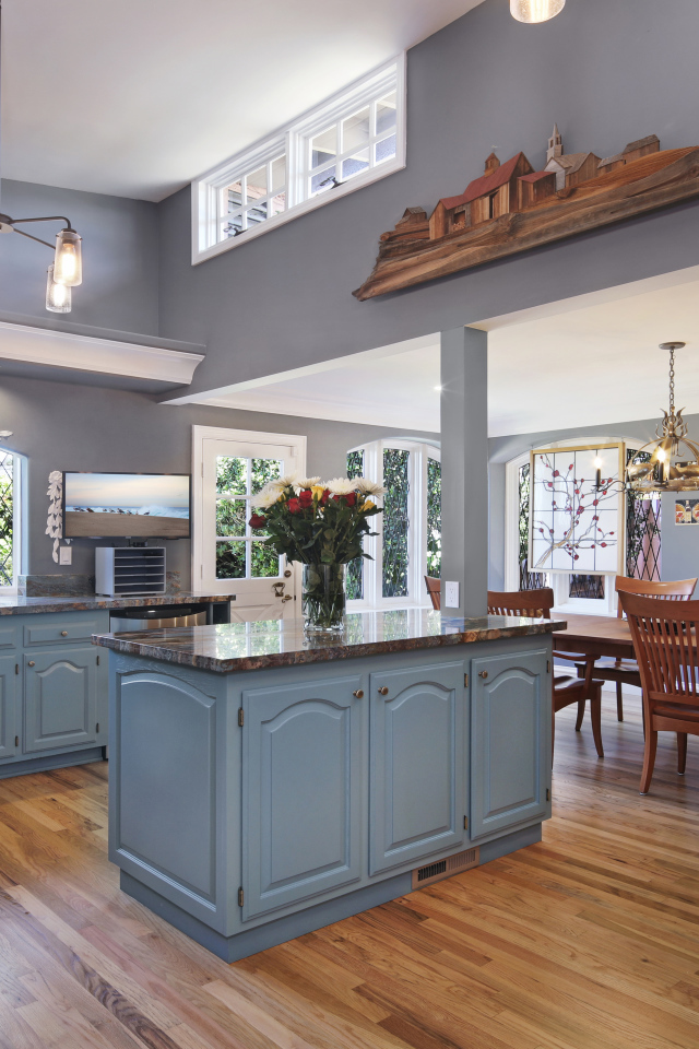 Большая красивая кухня в сером цвете с деревянным столом Обои для рабочего стола 640x960