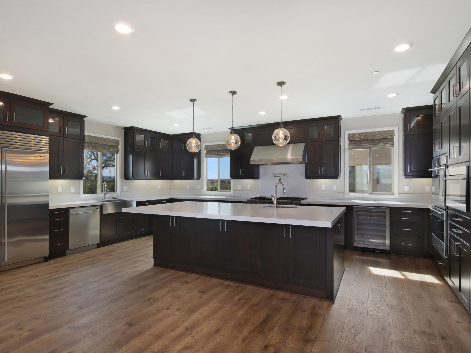 Большая просторная кухня с мебелью в коричневых тонах - 5616x3744
