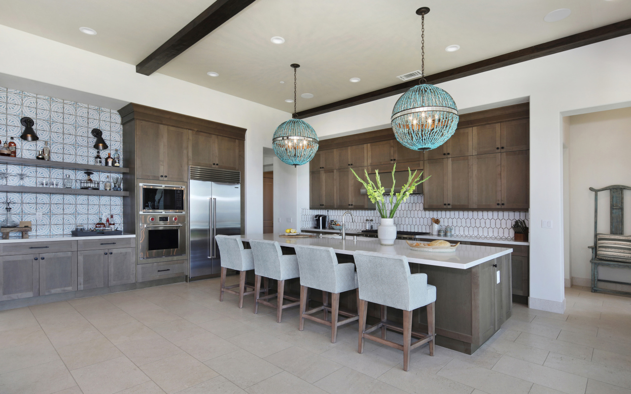 Огромная кухня со столовой с букетом цветов на столе - 5055x2999