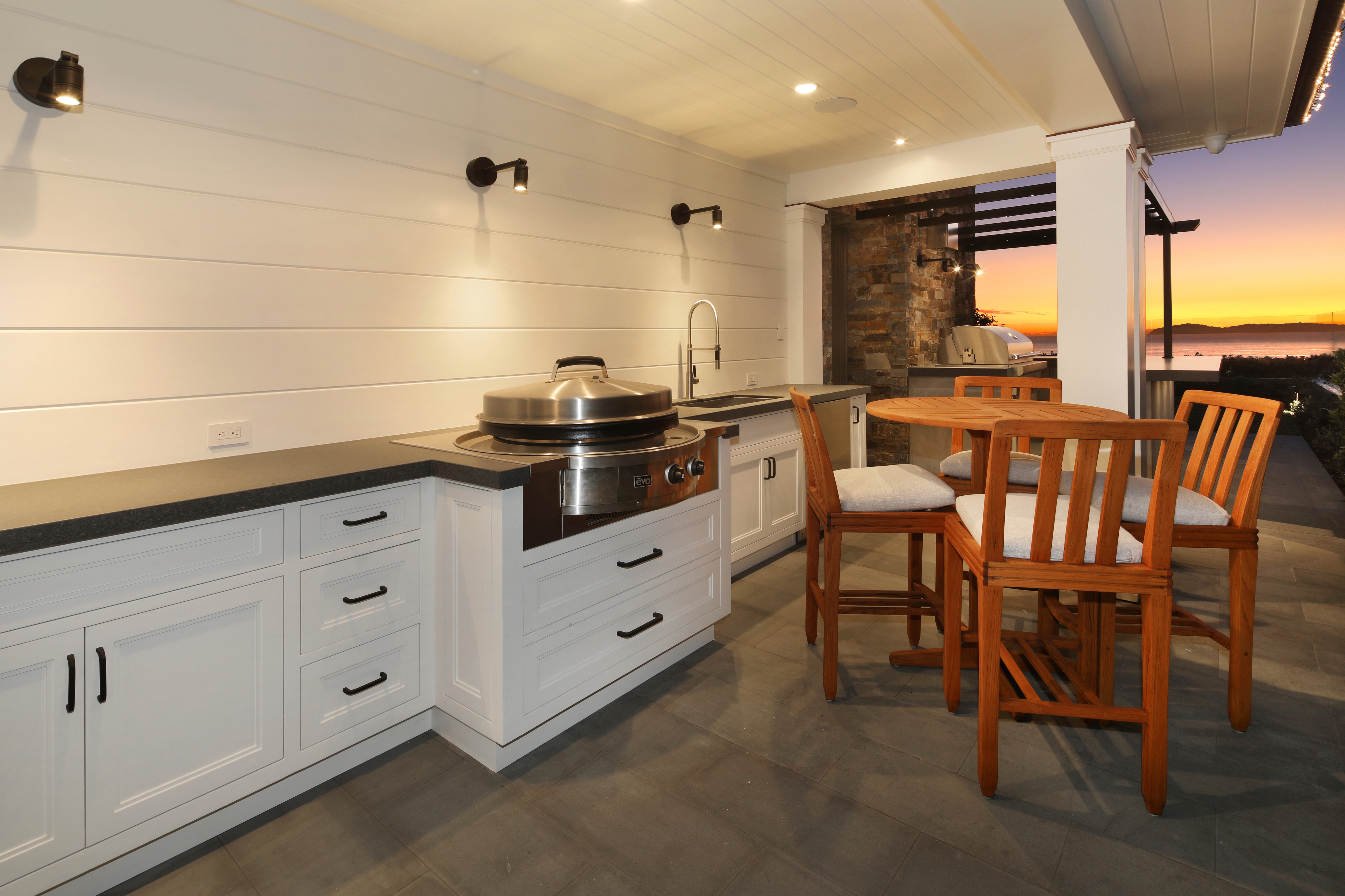 Большая кухня с деревянным столом и видом на море - 5616x3744