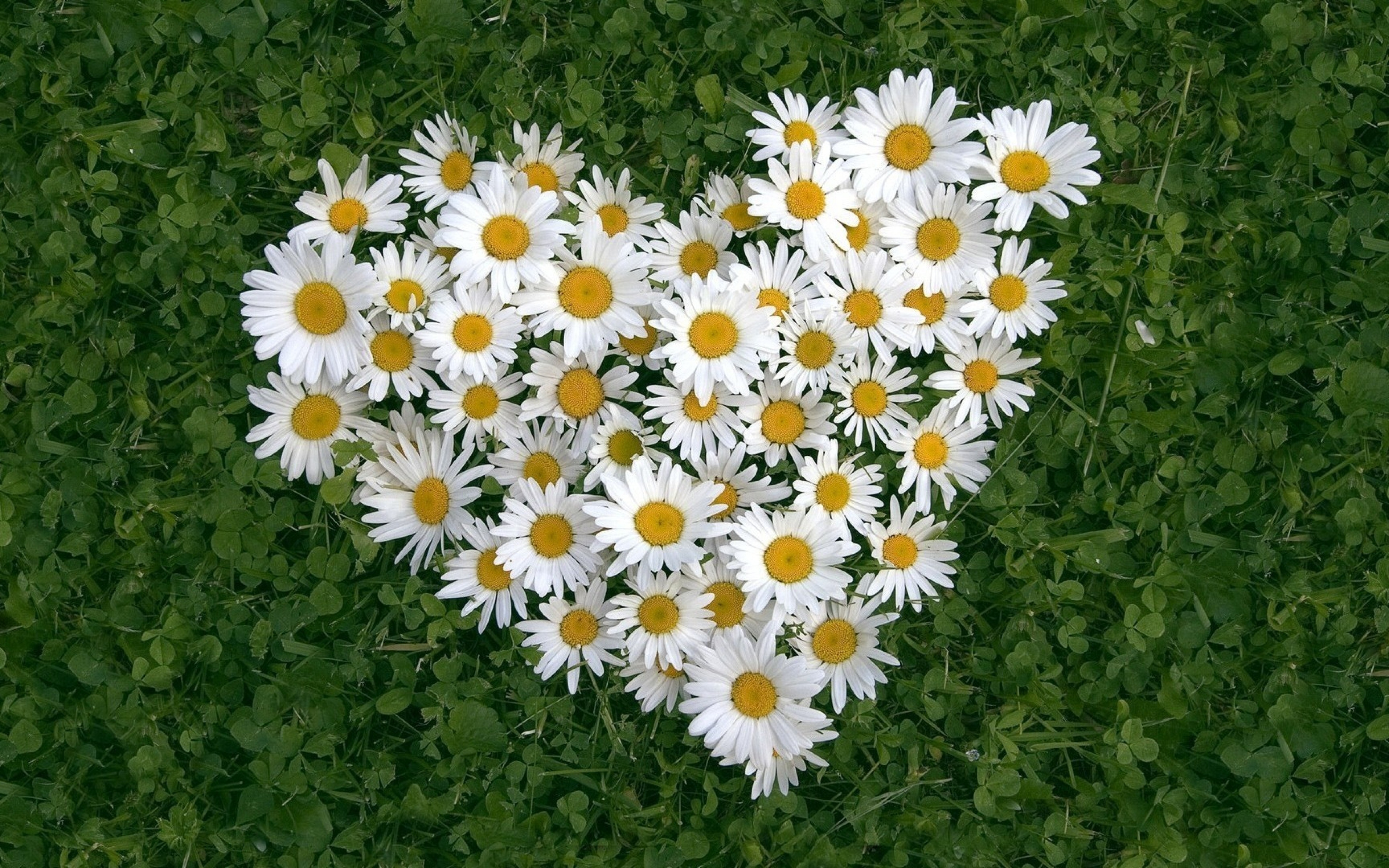 Обои: Сердце из белых цветов ромашки на зеленой траве