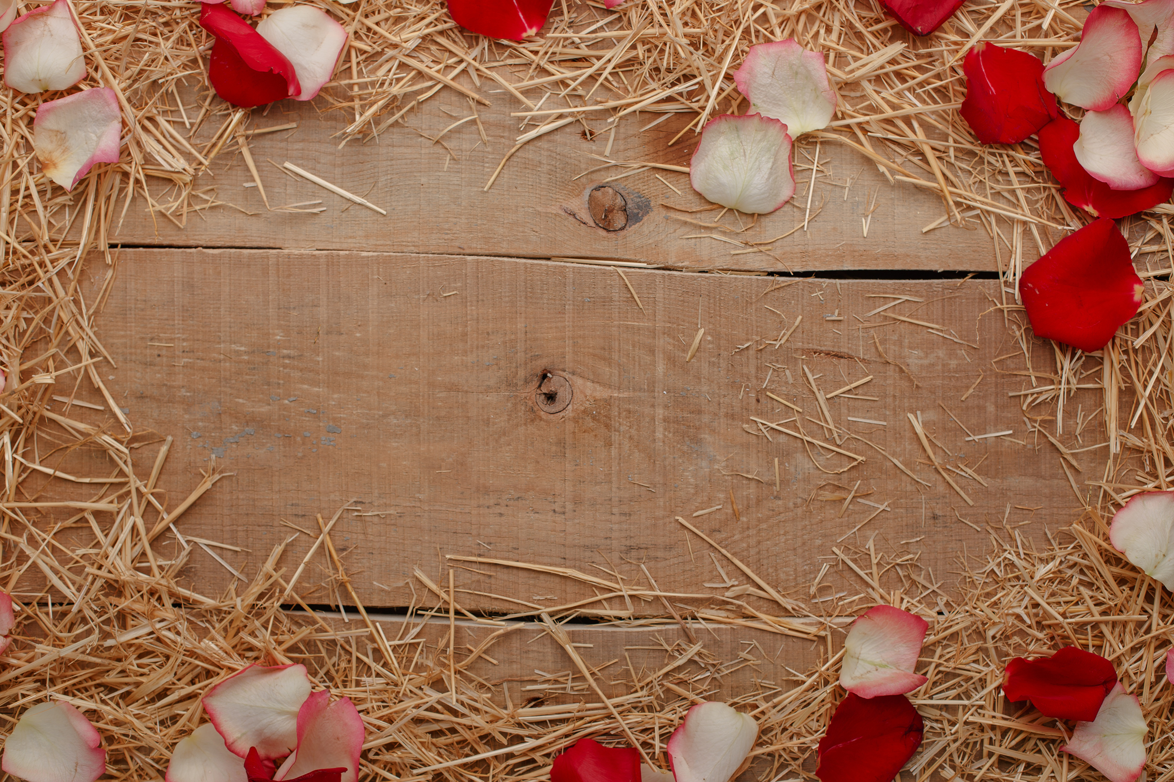 Сено и лепестки роз на деревянном столе - 3840x2560