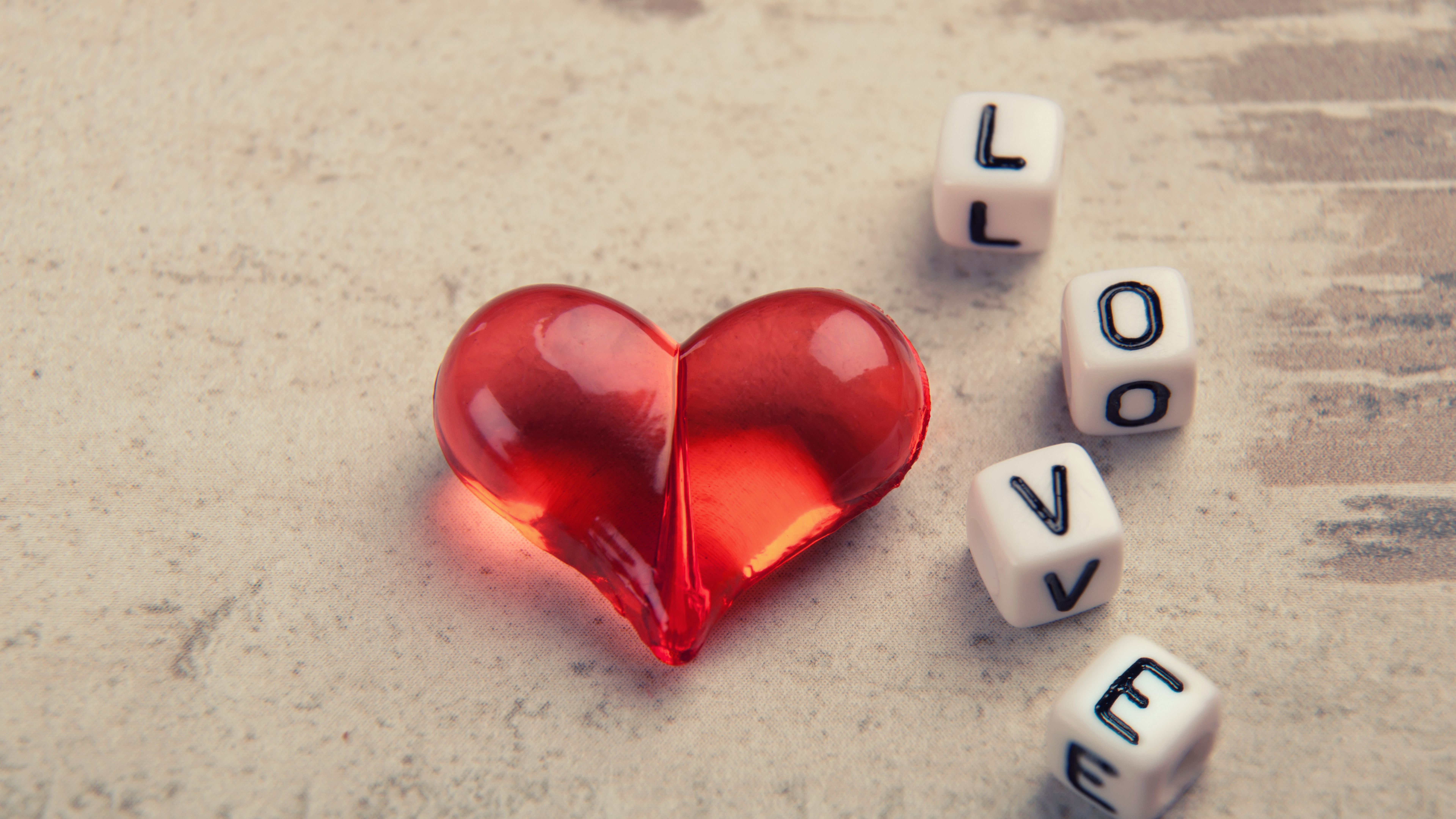 Красное стеклянное сердце на столе с кубиками - 7680x4320