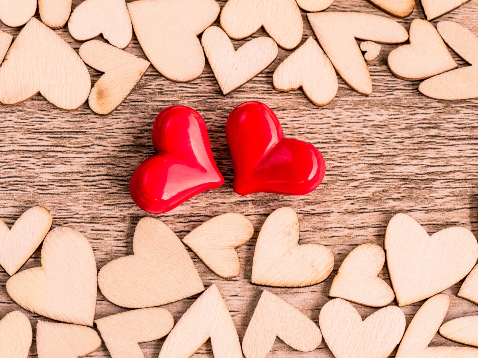 Два красных сердца и деревянные сердечки на столе - 5520x3684