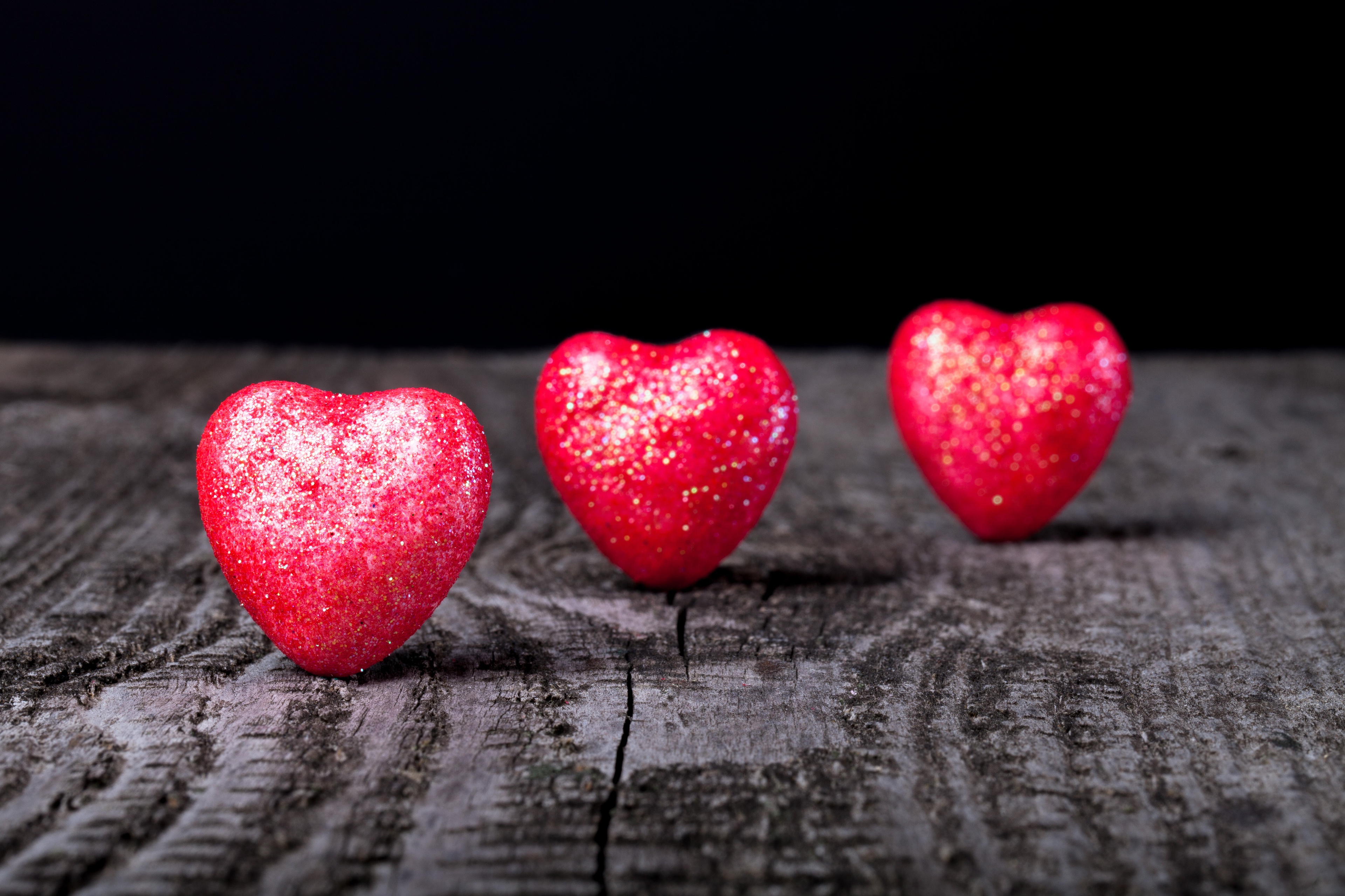 Блестящие красные сердечки на деревянном столе - 3840x2560