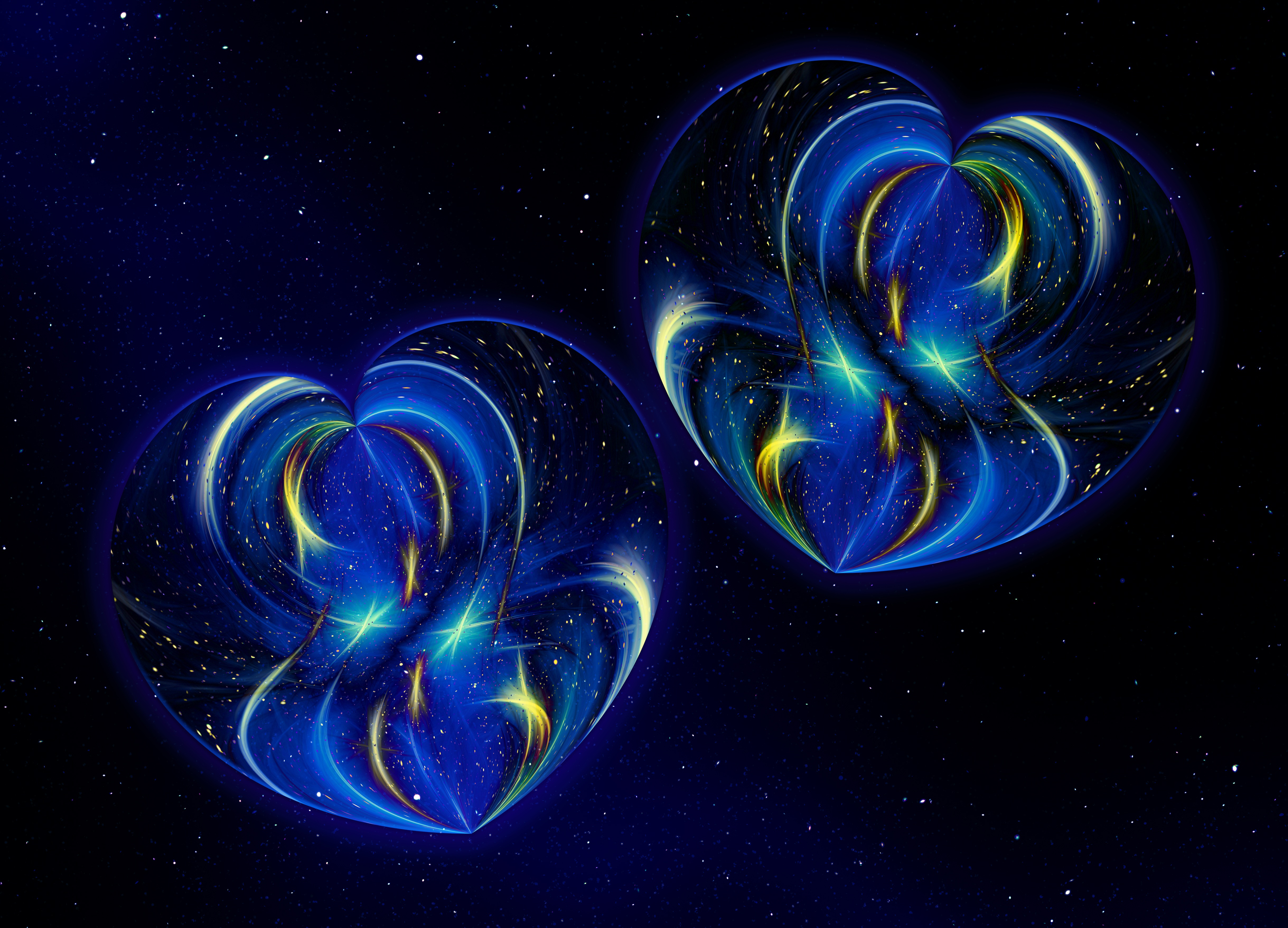 Два красивых неоновых сердца на синем фоне - 4877x3515