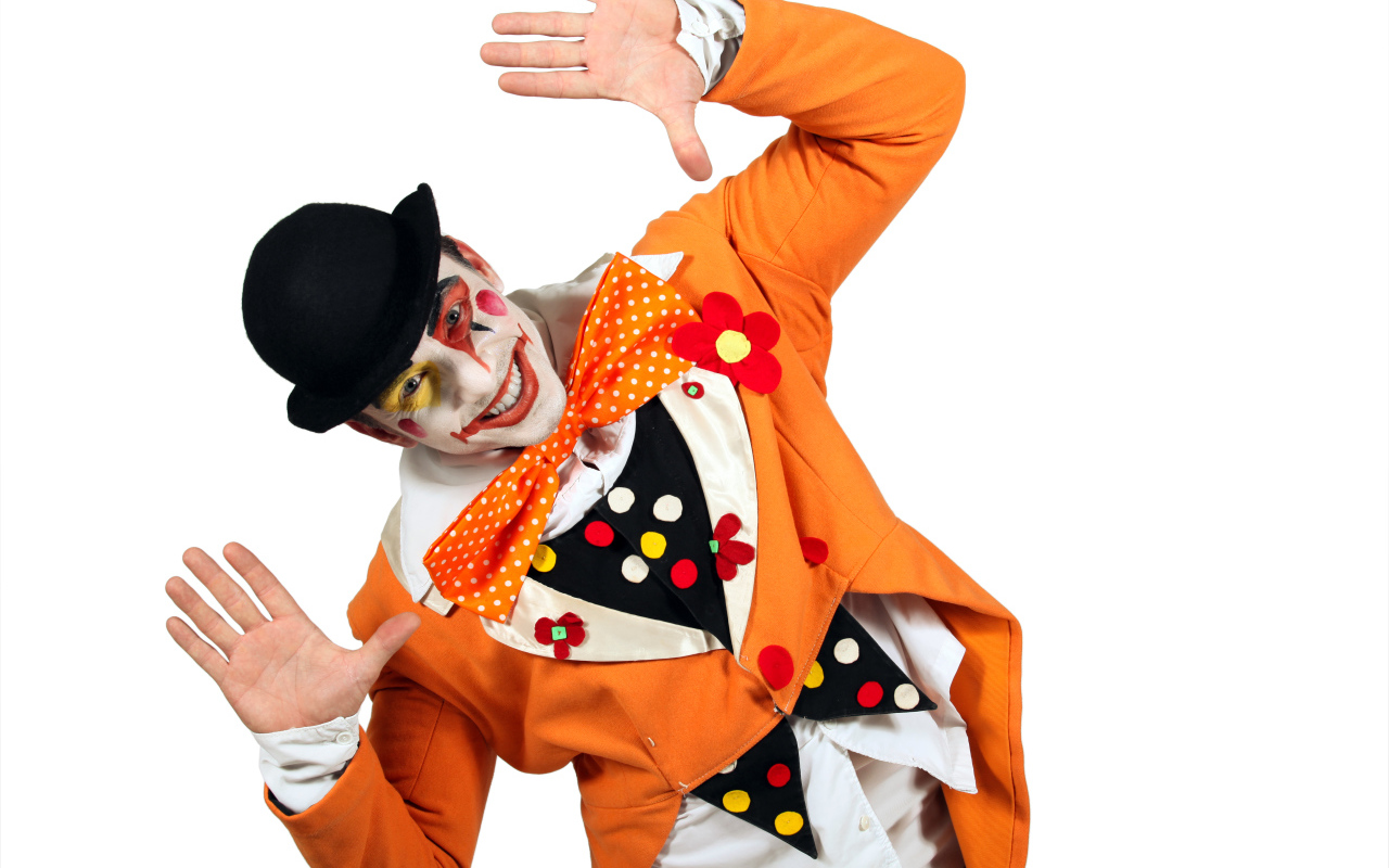 Улыбающийся мужчина клоун на белом фоне - 5616x3744