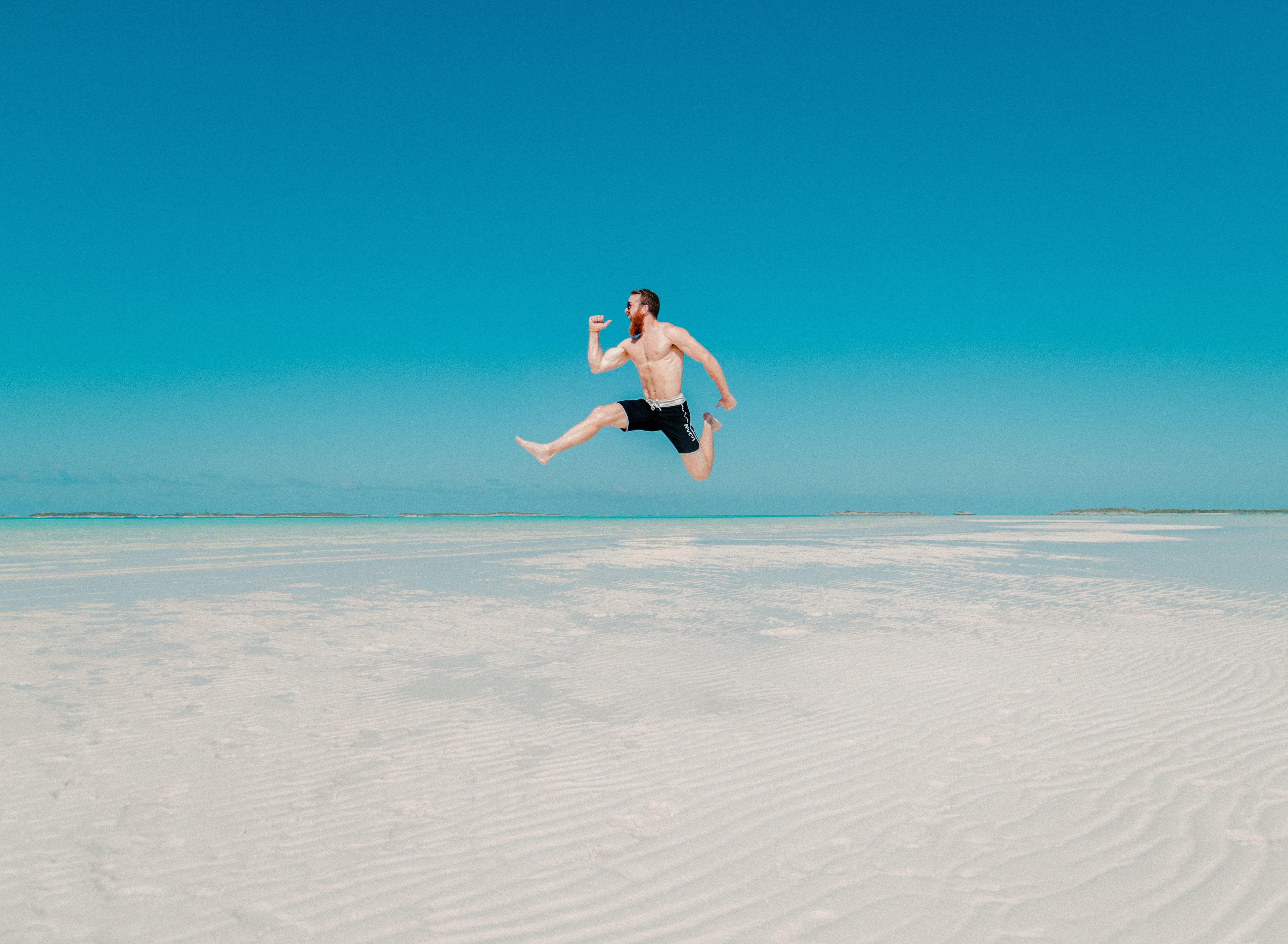 Довольный мужчина прыгает в воде на голубом фоне - 4938x3618