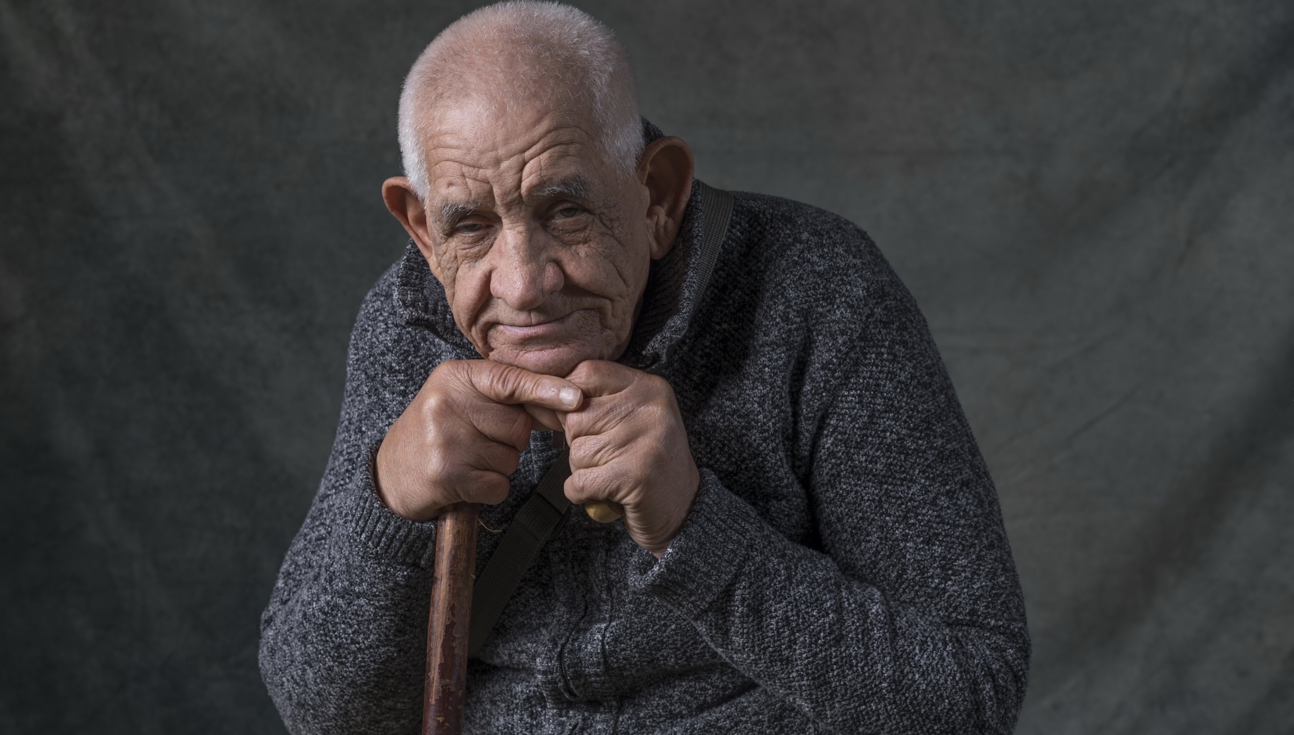 Обои: Пожилой мужчина в теплом свитере на сером фоне