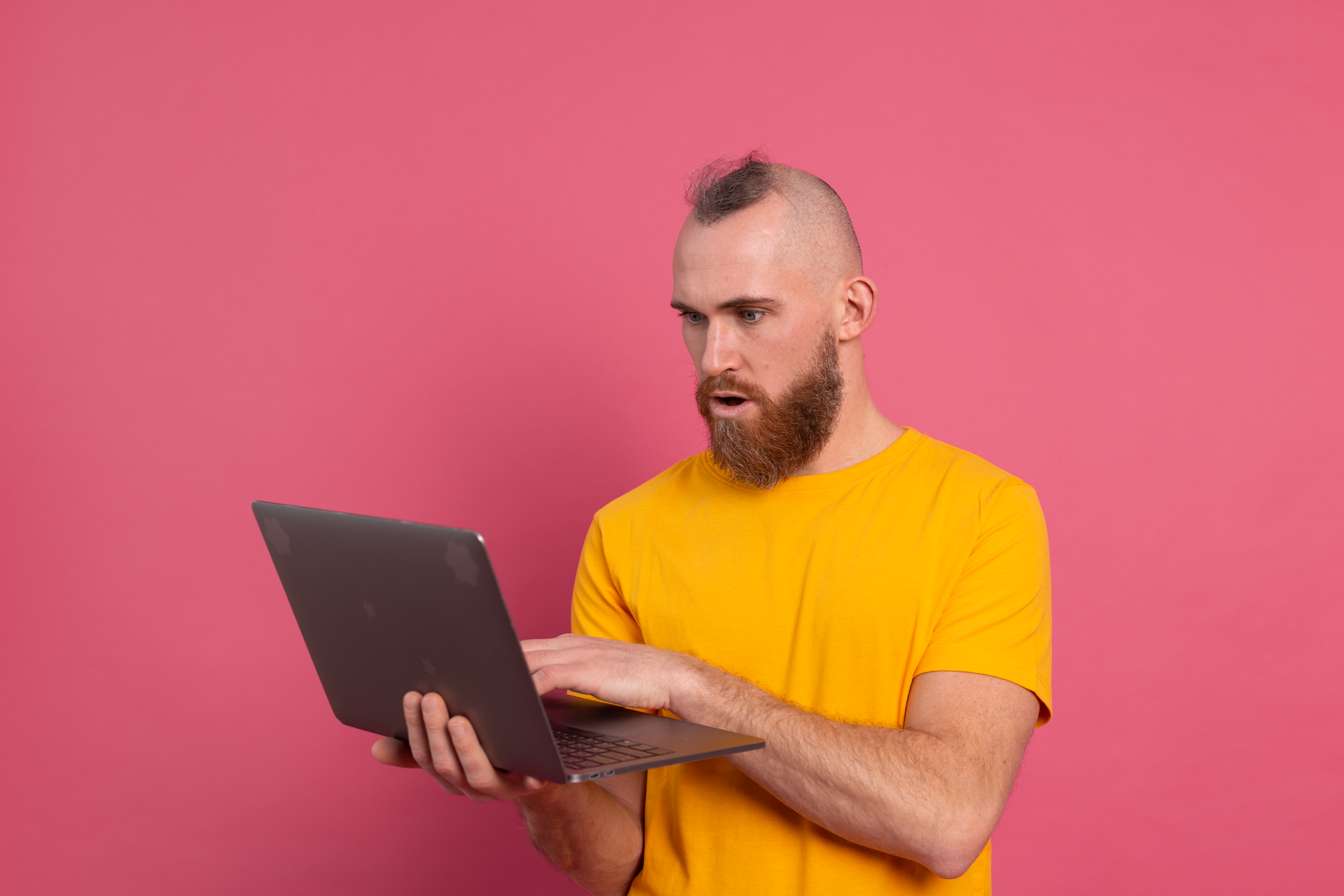 Удивленный мужчина с ноутбуком на розовом фоне - 5760x3840