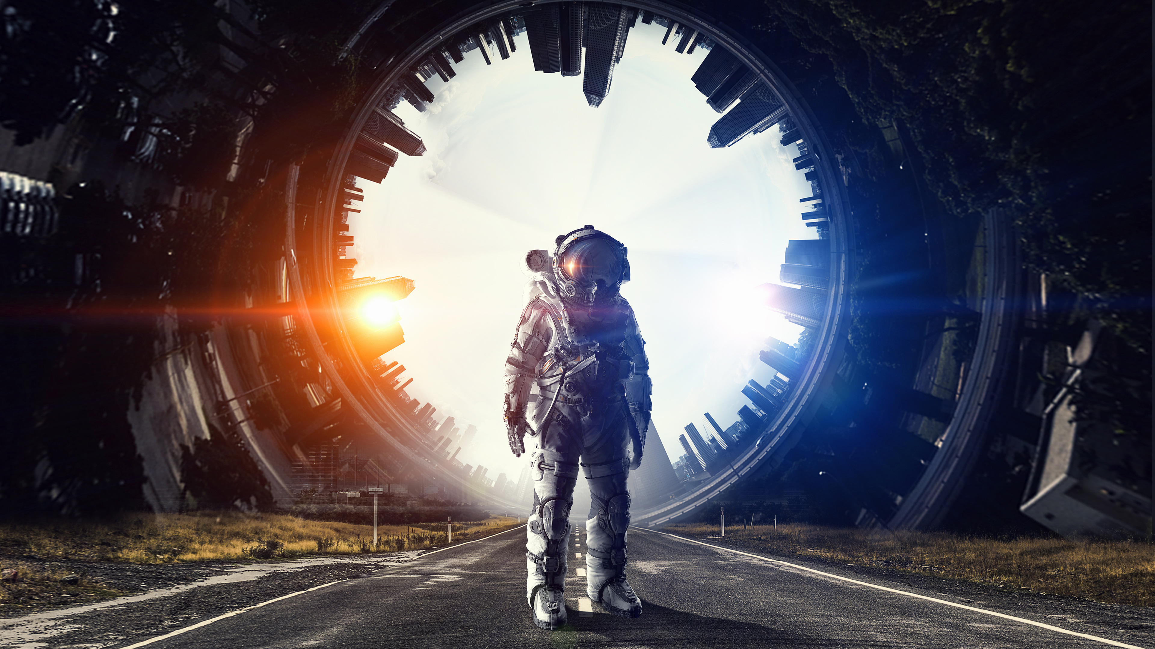Мужчина астронавт с космическим кораблем на дороге - 3840x2160