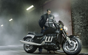 Большой черный мотоцикл Triumph Rocket 3, 2021 года у воды