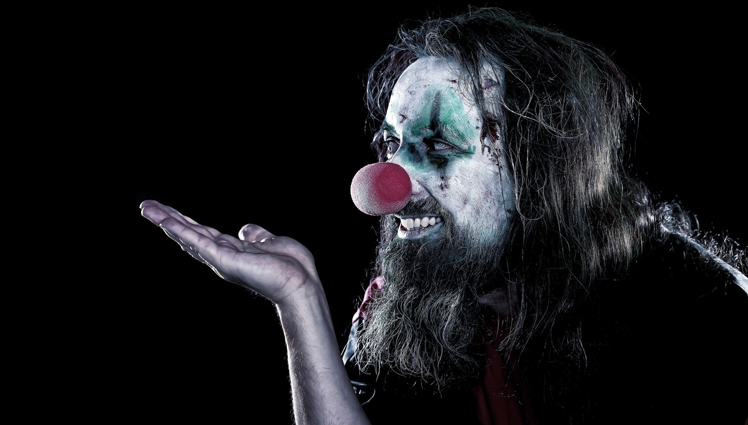 Страшный мужчина клоун на черном фоне - 2533x1440