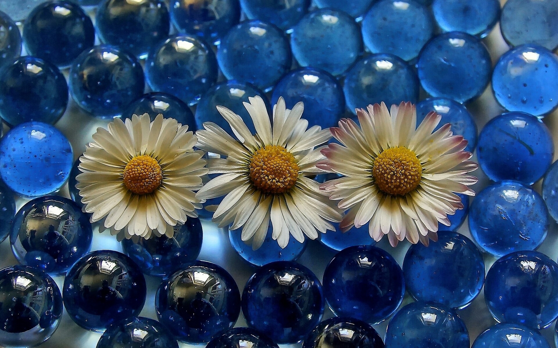 Обои: Три белых ромашки на голубых прозрачных шариках