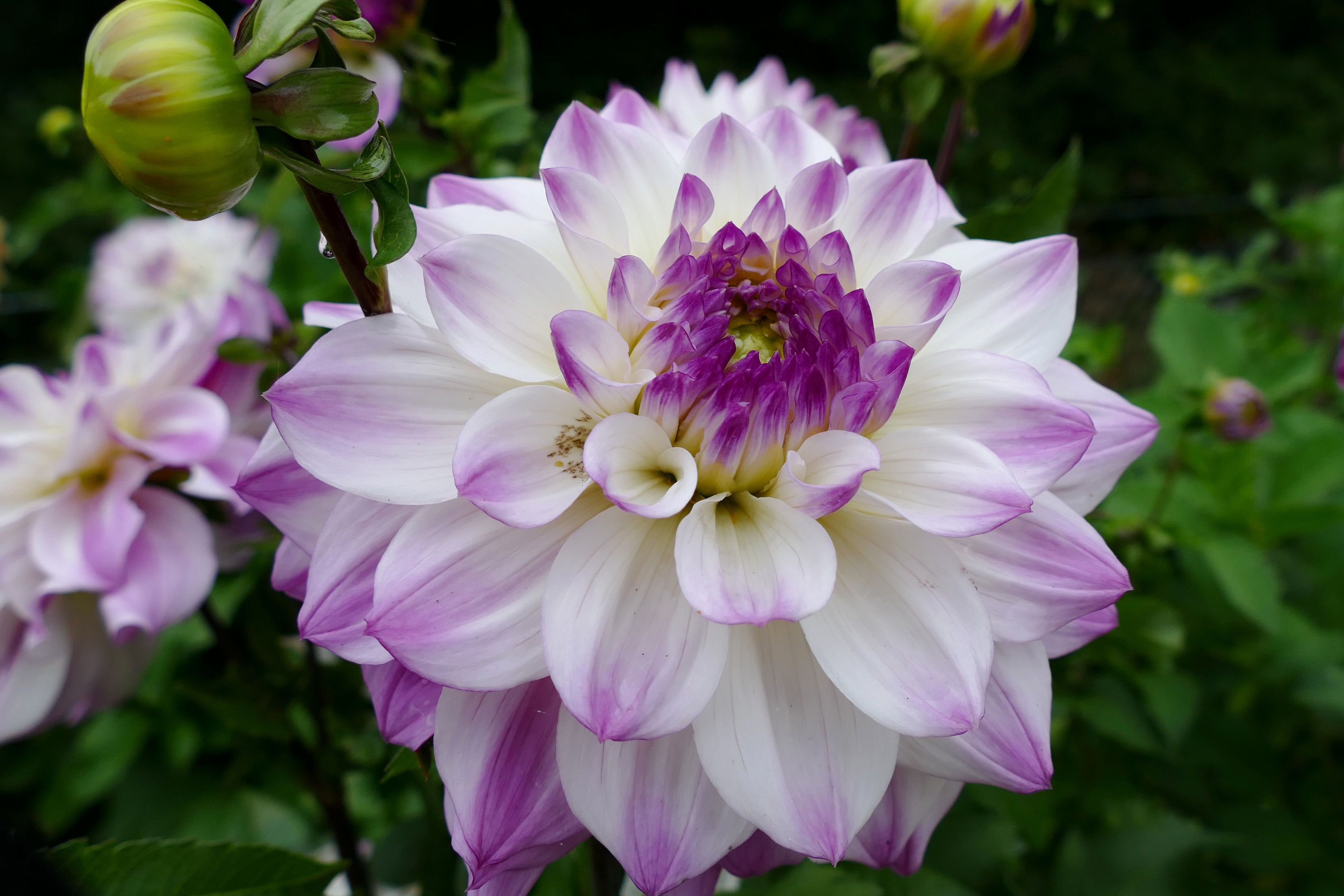 Бело - фиолетовый цветок георгины вблизи - 3300x2200