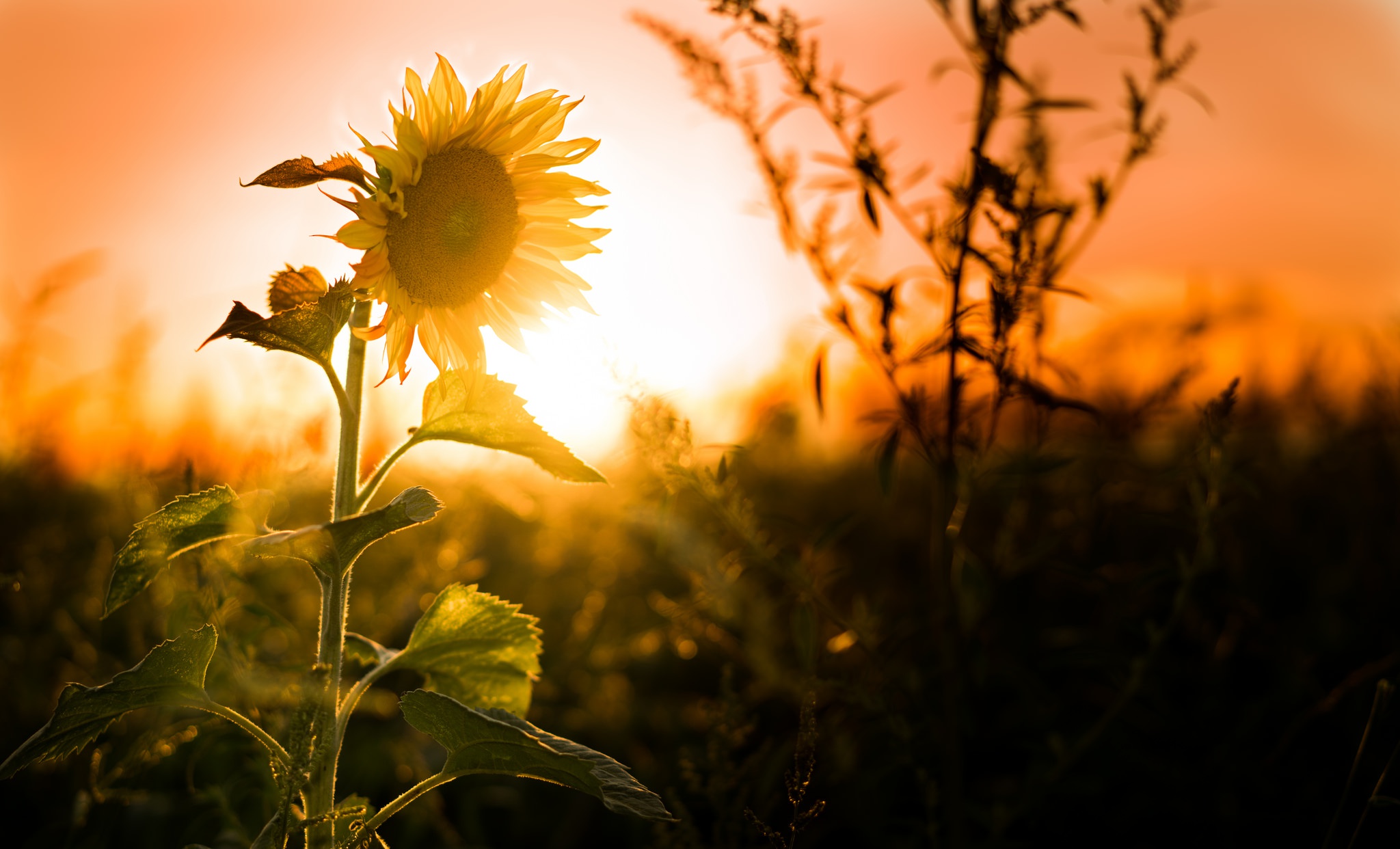 Желтый цветущий подсолнух на закате солнца - 2048x1242