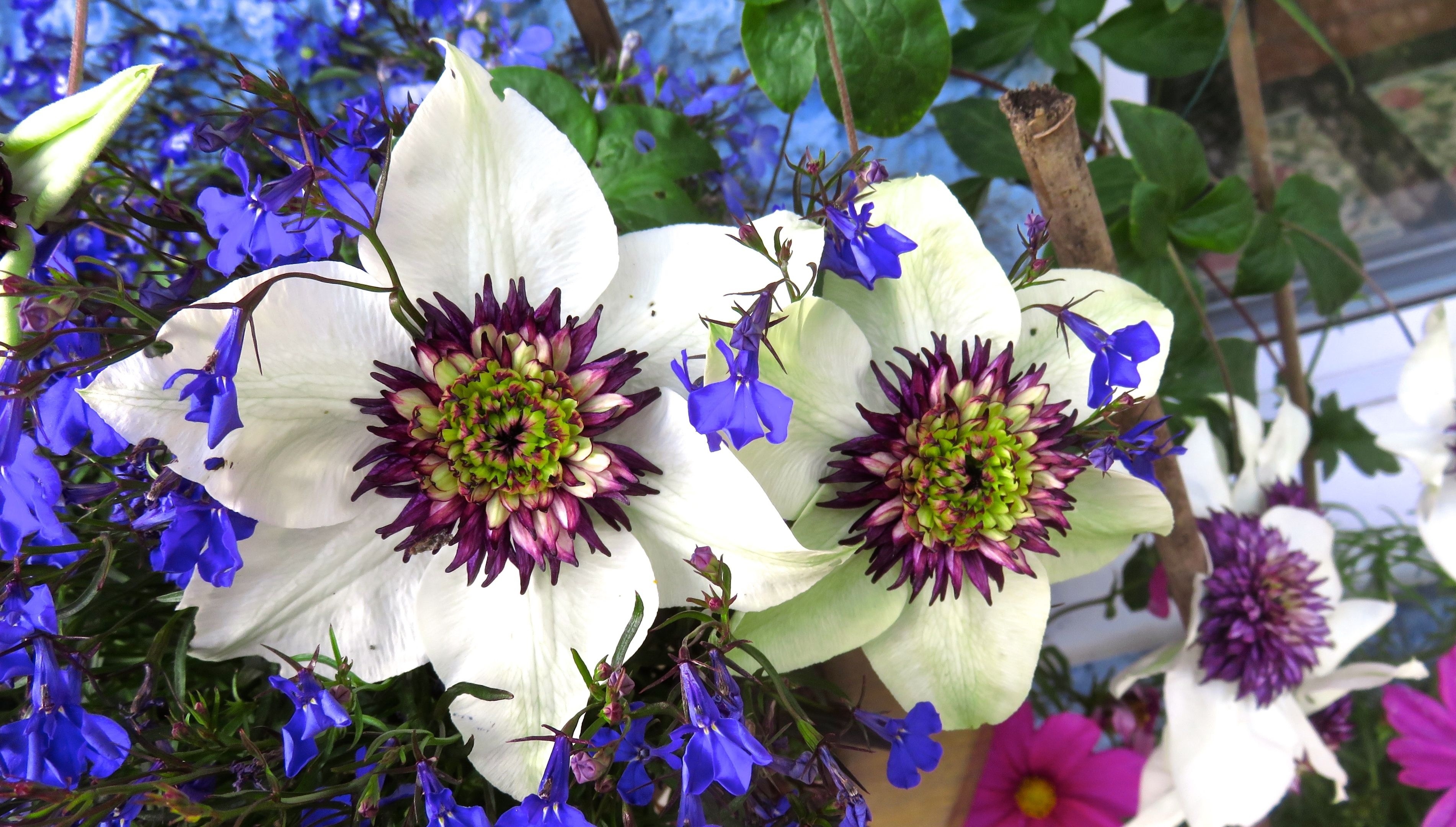 Обои: Красивые цветы клематисы с голубыми полевыми цветами