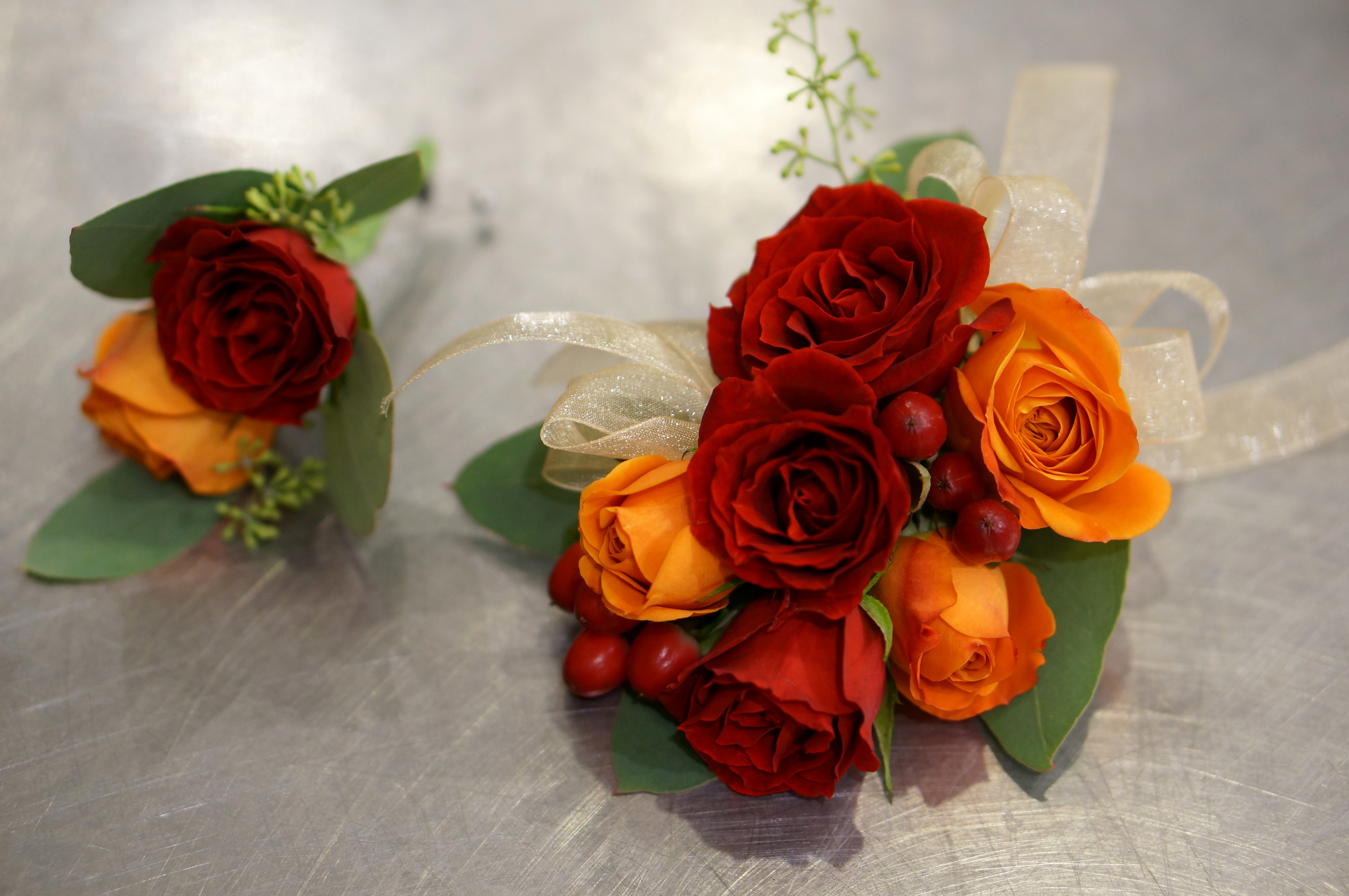 Обои: Красивый букет и бутоньерка на столе