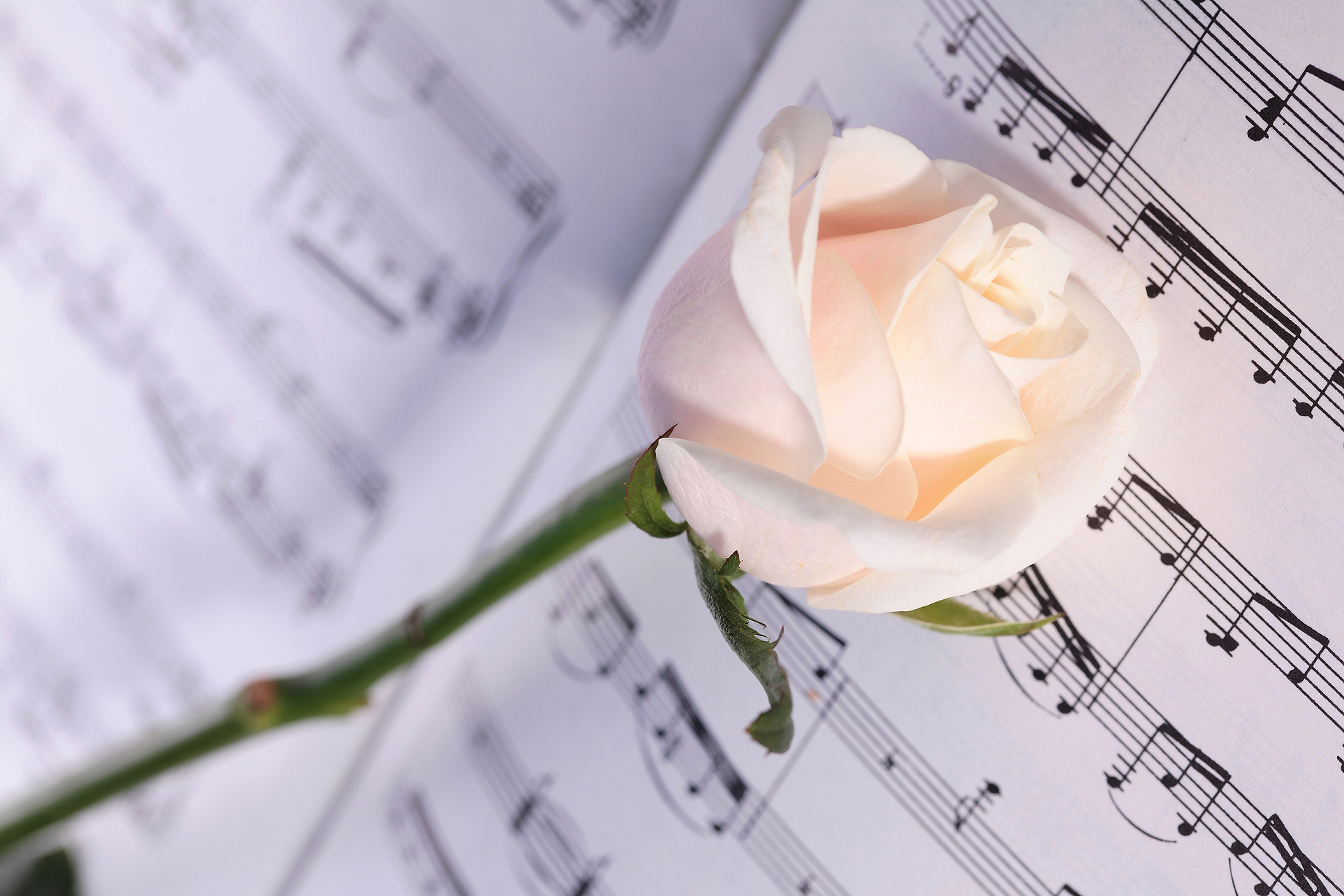 Нежная кремовая роза лежит на нотах - 6000x4000