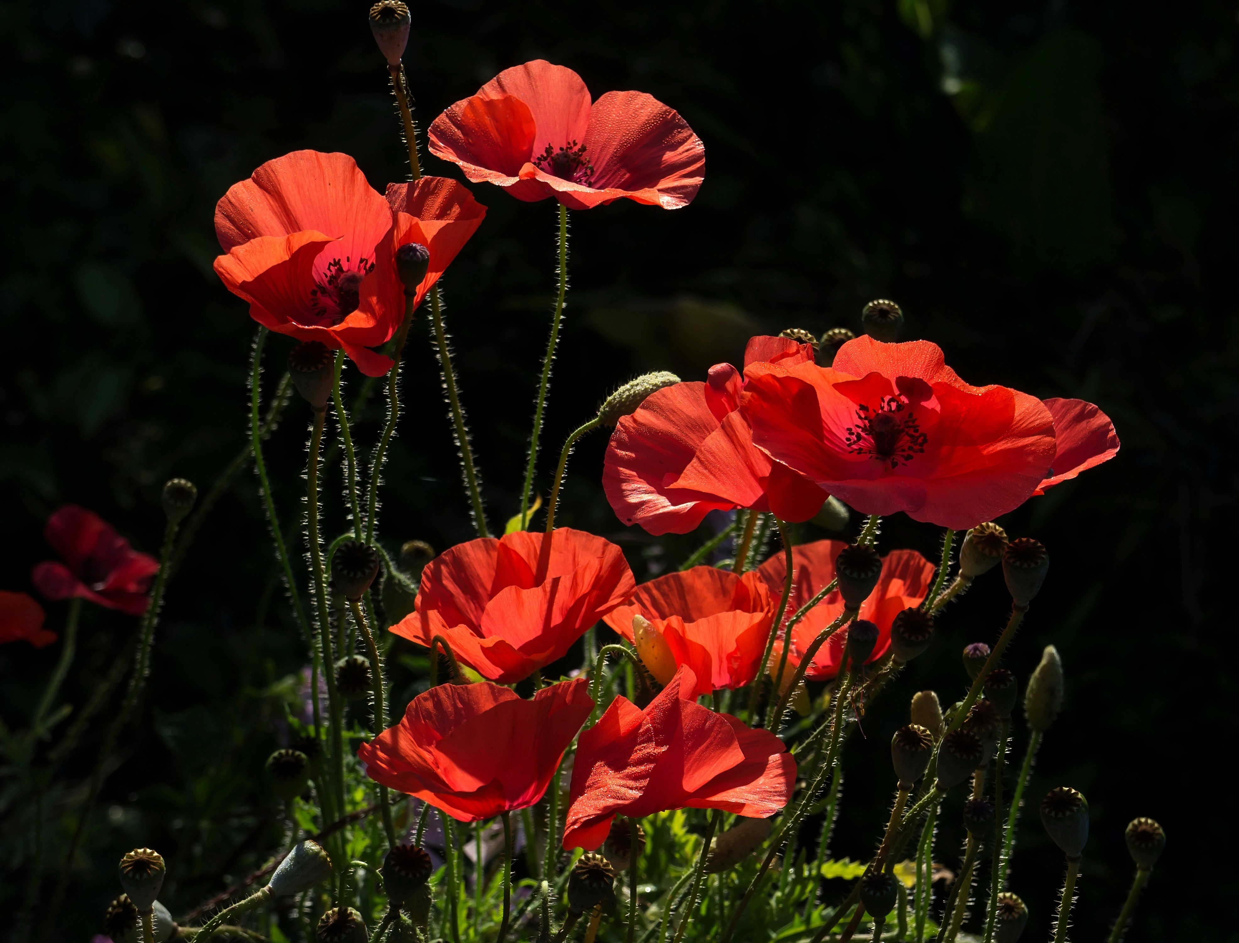 Яркие красные летние маки в лучах солнца - 3943x3000