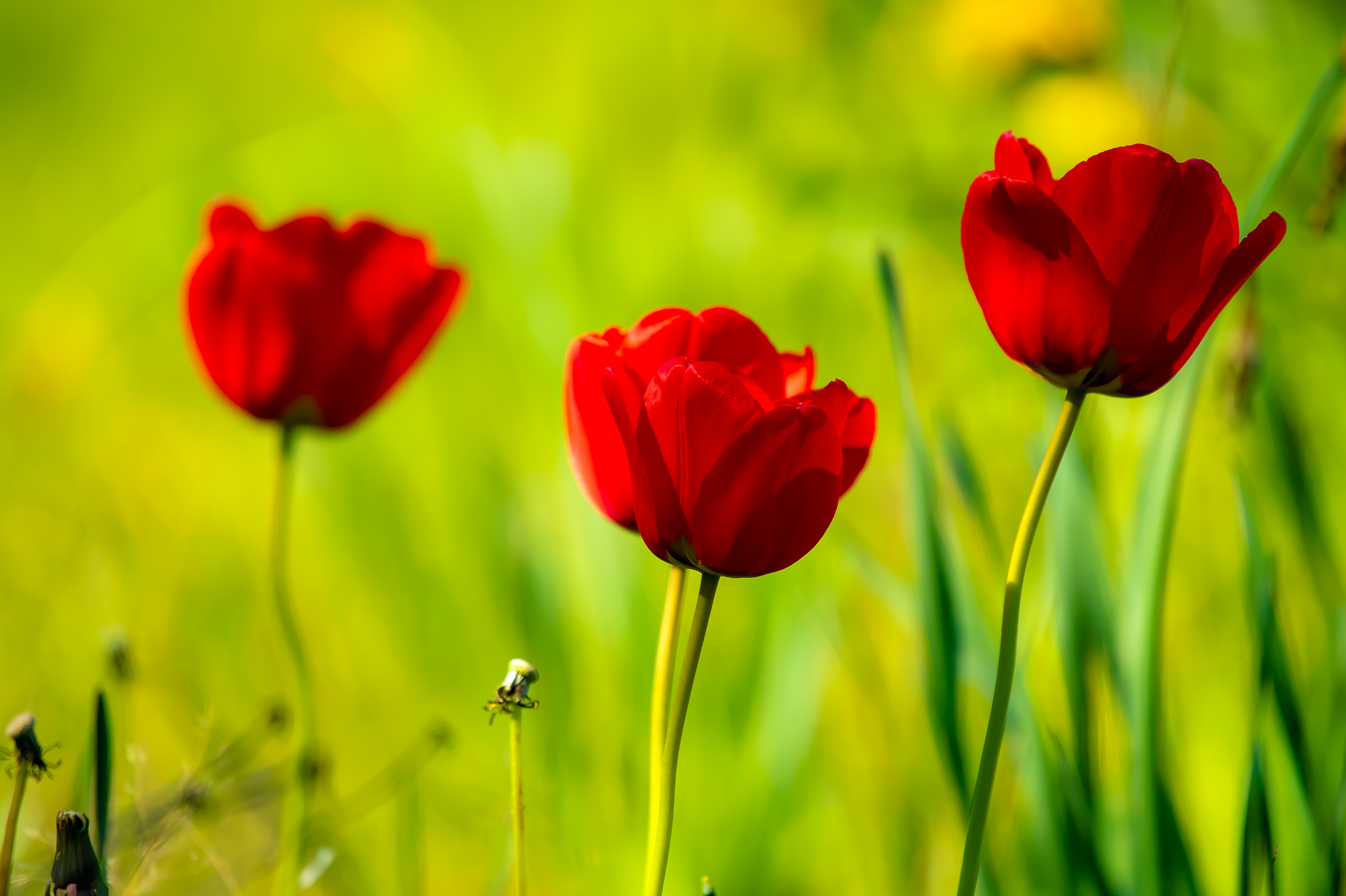 Четыре красных тюльпана в лучах солнца - 4928x3280